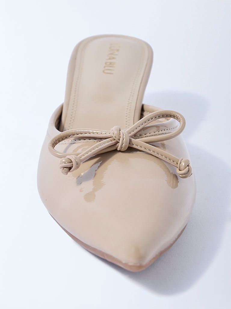 Take your style up a notch with these beige mules from Luna Blu. Designed with a sleek pointed toe and a dainty bow accent. they bring a feminine finish to any look. The cushioned footbed ensures comfort through the day. while the low kitten heel offers just the right lift for work or evenings out.