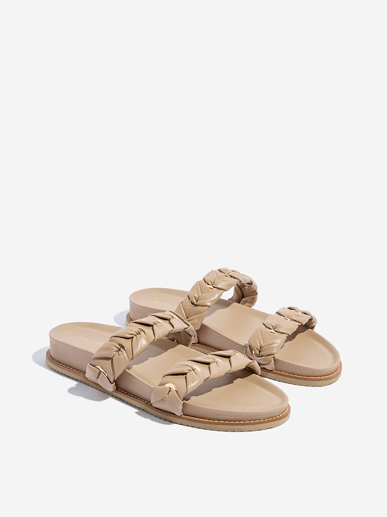 These beige sandals from Luna Blu are fashioned with dual intricately braided straps for a refined look. A padded footbed offers lasting comfort. while the durable outsole delivers dependable traction with every step.