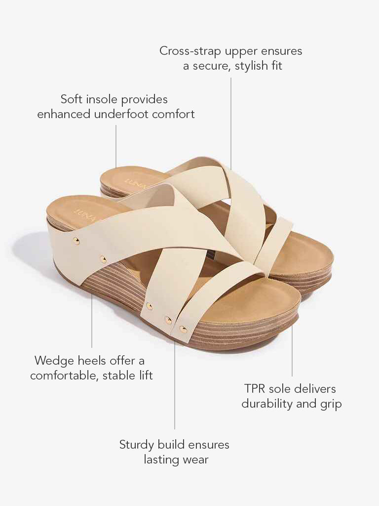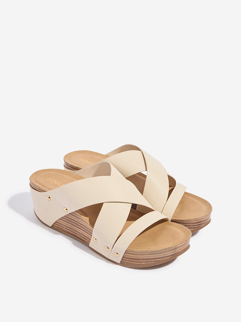 These beige wedge-heel sandals by Luna Blu feature a stylish cross-strap upper for a secure fit. They offer both comfort and stability and are designed with a soft insole. a sturdy wedge build. and a durable outsole.