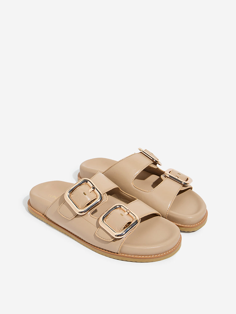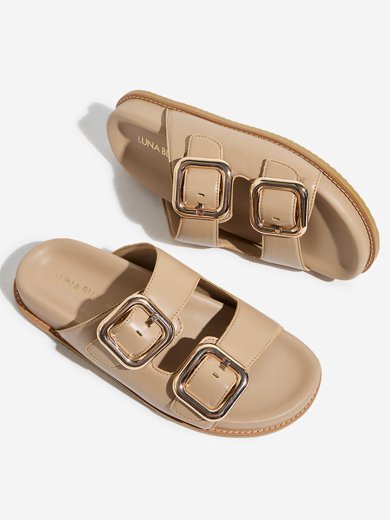 Add a touch of charm with Luna Blu’s comfort sandals in beige. Featuring a double-belted upper with elegant gold-toned buckles. they are both stylish and practical. A cushioned insole and textured outsole ensure all-day comfort and grip.
