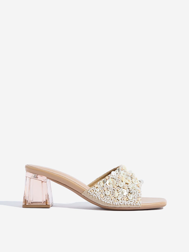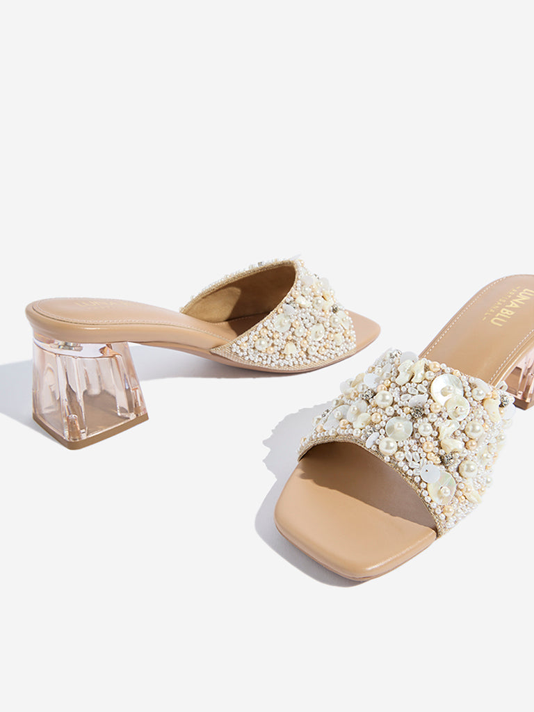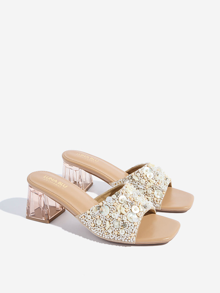 These beige sandals from Luna Blu are beautifully adorned with pearlescent beads and shimmering sequins on the broad strap. Set on a transparent block heel. they offer a modern look. while the soft insole provides steady support for all-day wear.