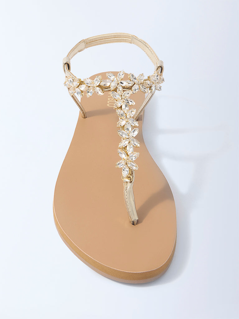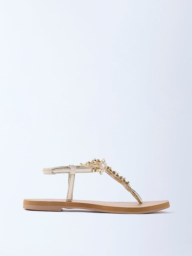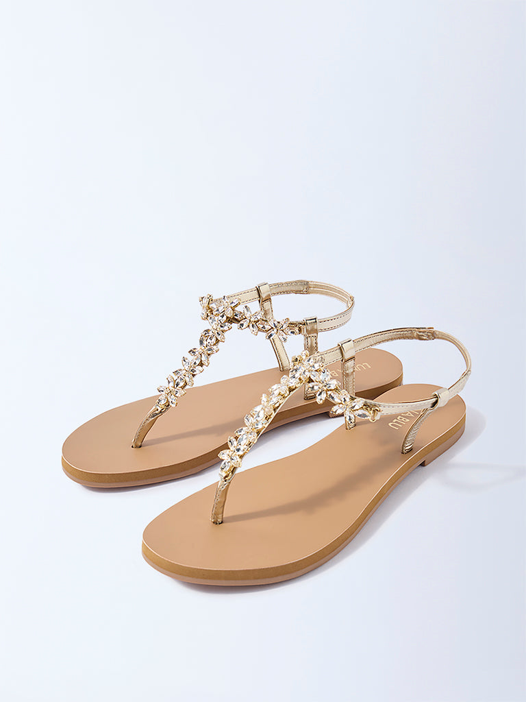 Slip into carefree charm with these beige thong-strap sandals from Luna Blu. where delicate floral embellishments shimmer softly with every step. Perfect for breezy days that flow into festive evenings. the cushioned insole keeps you at ease while the textured sole ensures you move with confidence.