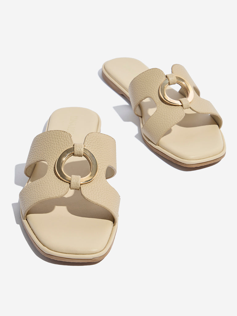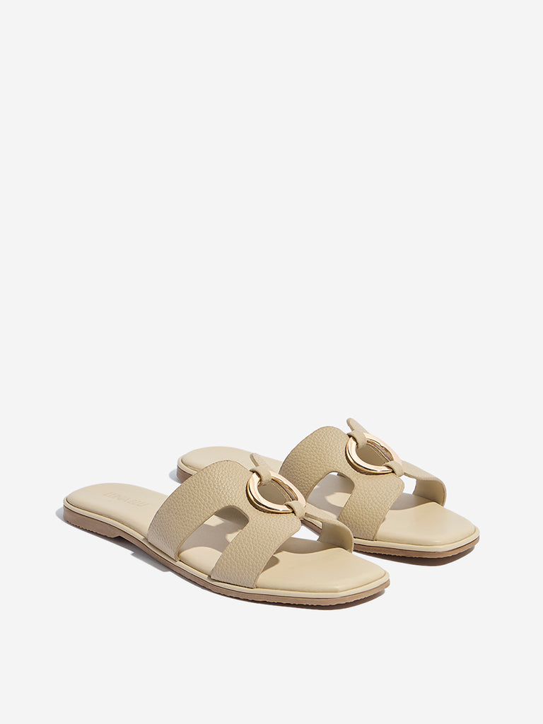 These beige slides from Luna Blu feature sleek hardware detailing on the broad strap for a modern touch. Constructed from durable materials. they’re designed with a cushioned footbed and a textured outsole to ensure all-day comfort and a secure grip with every step.