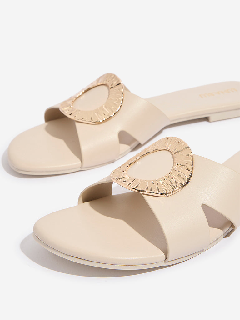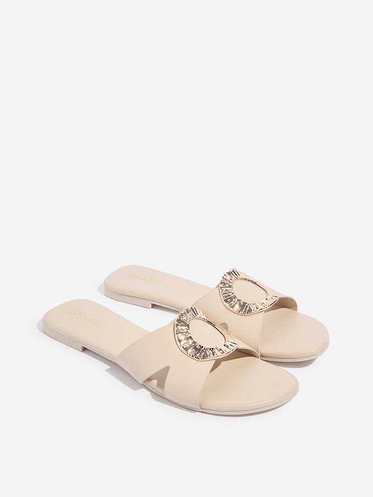 These stylish slides by Luna Blu feature a beige vinyl strap upper with a chic cut-out design. accented by a round textured gold-tone hardware detail. The soft insole and durable outsole ensure lasting comfort with every step.