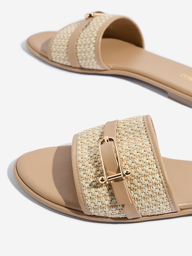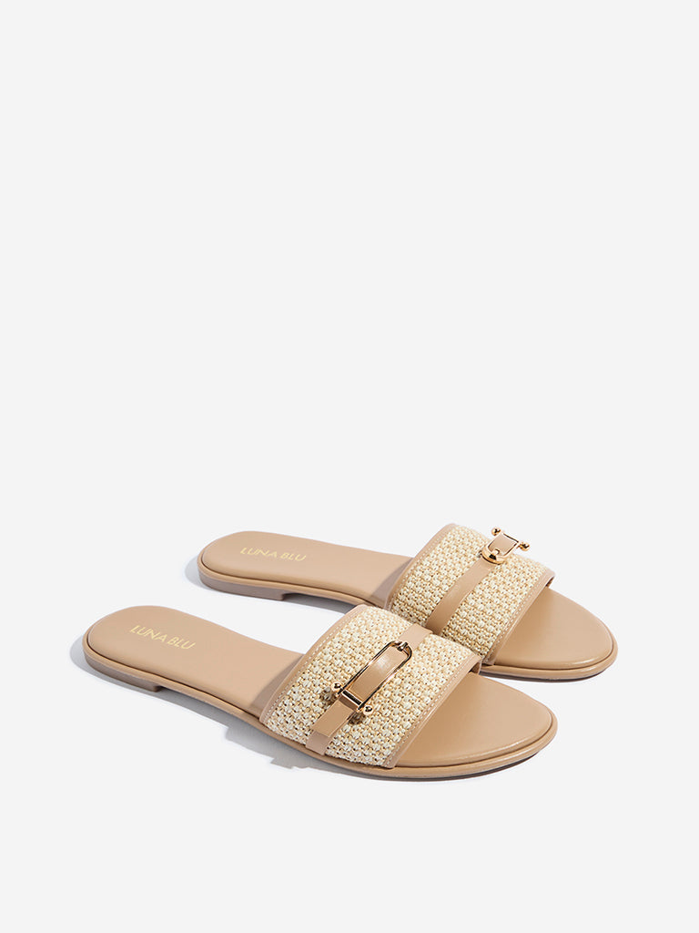 These beige slides from Luna Blu offer a breezy blend of style and comfort. Designed with a jute-textured wide strap and a polished buckle detail. they bring a natural yet refined vibe to your step. The cushioned insole ensures lasting comfort. while the textured outsole keeps things steady all day.