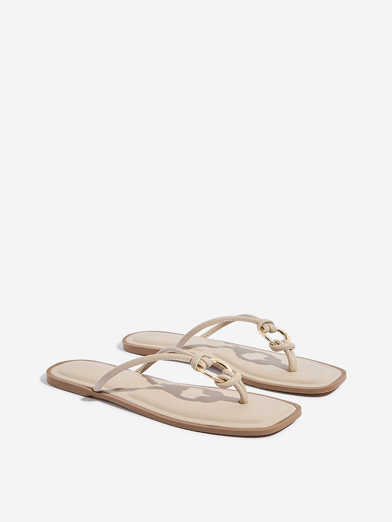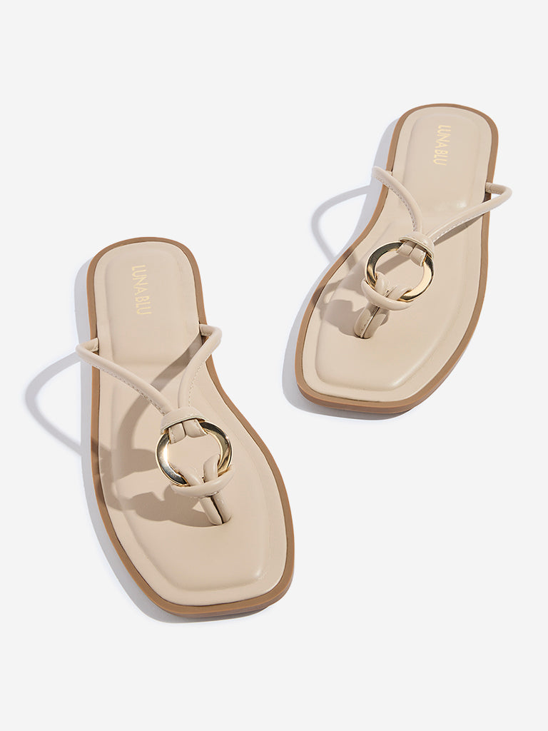 These beige slides from Luna Blu blend elegance with everyday comfort. Featuring dual straps adorned with a gold-toned ring. they add a refined touch to any look. Designed for all-day ease. they come with a cushioned footbed and a textured outsole for reliable grip and stability.