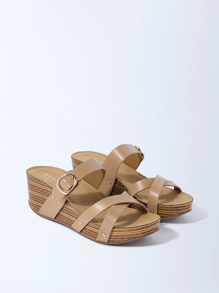These beige sandals from Luna Blu showcase a chic multi-strap design. punctuated by a gold-toned buckle that adds a hint of understated shine. Set on a sculpted wedge heel and lined with a cushioned footbed. they deliver a gentle lift without compromising on comfort.