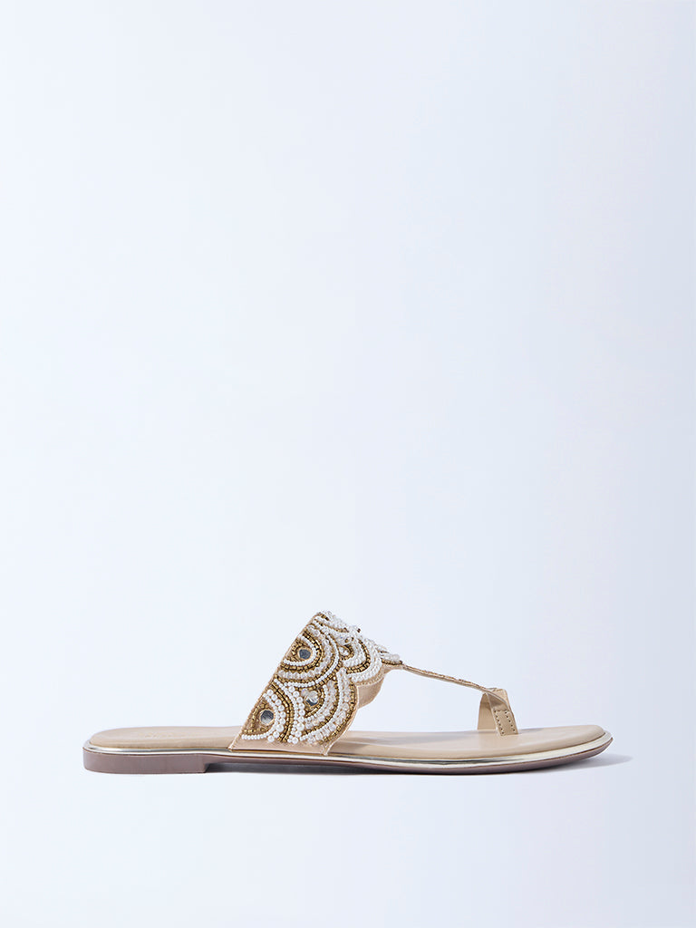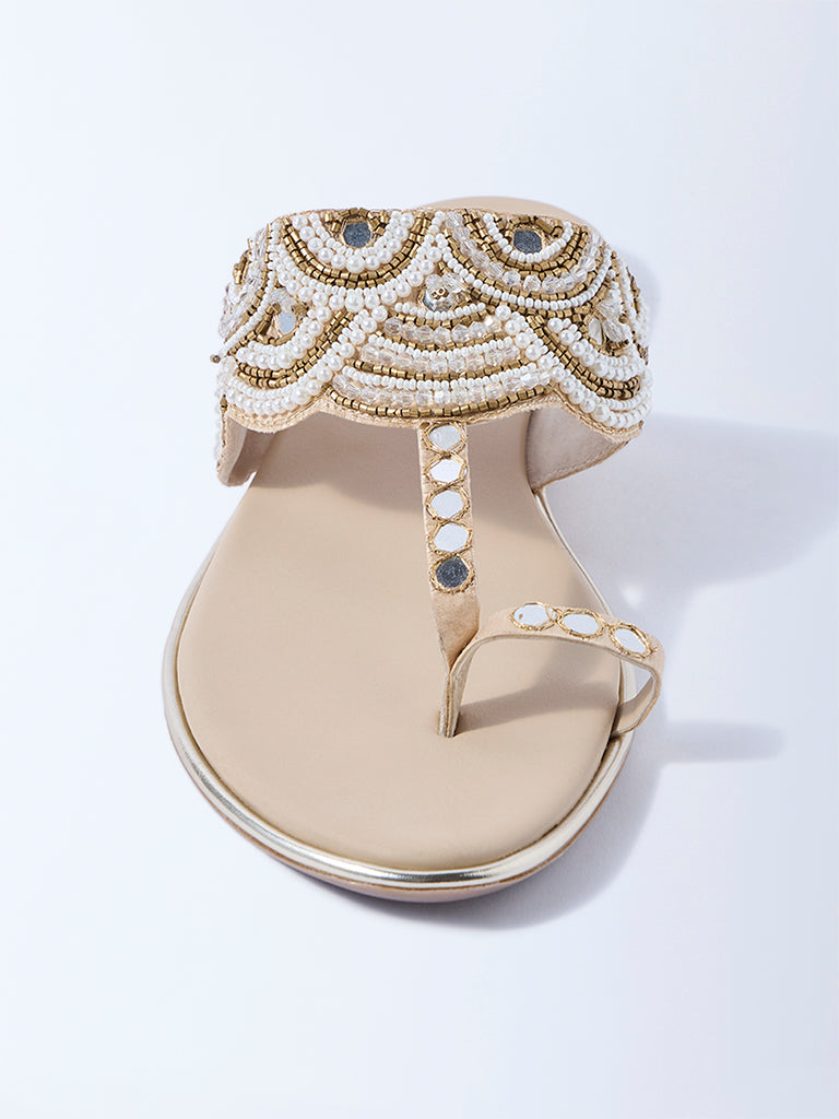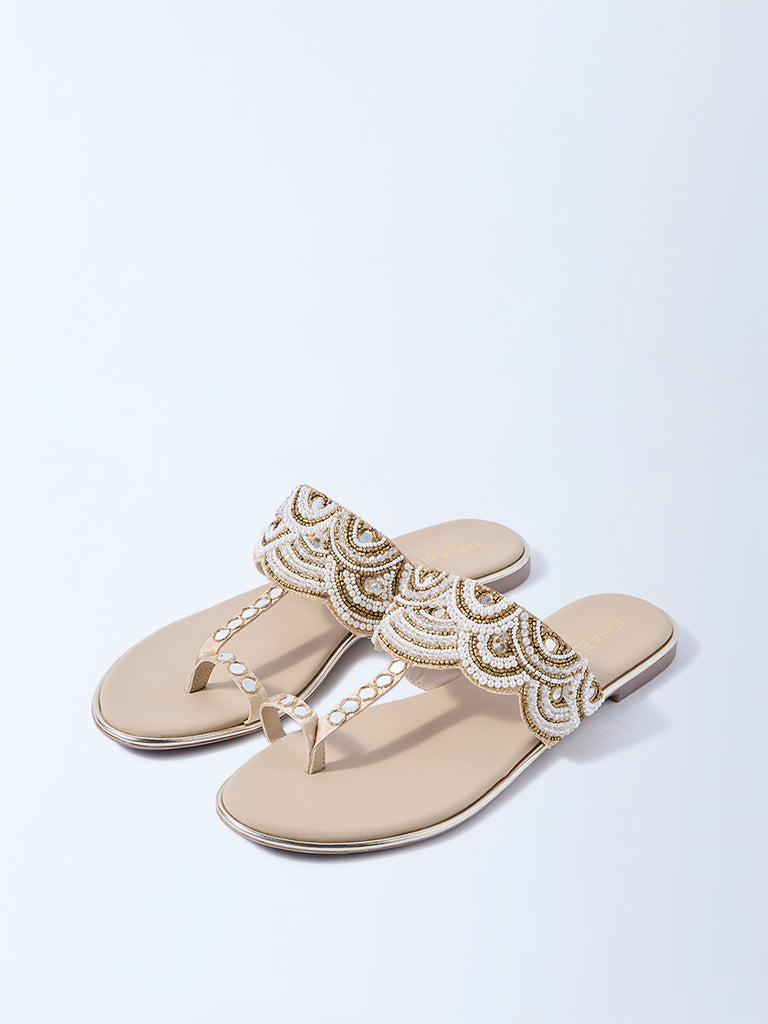 LUNA BLU Beige Pearlescent Kolhapuri Sandals