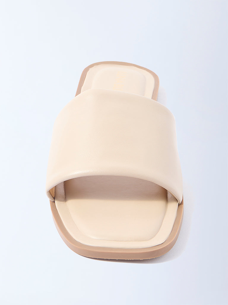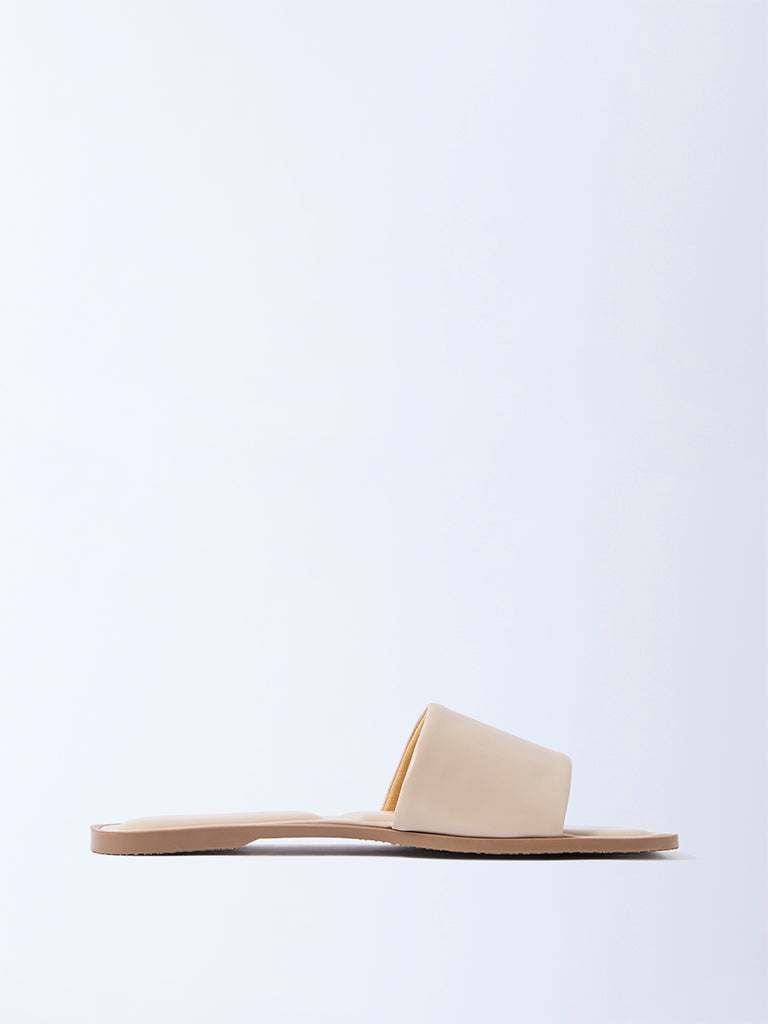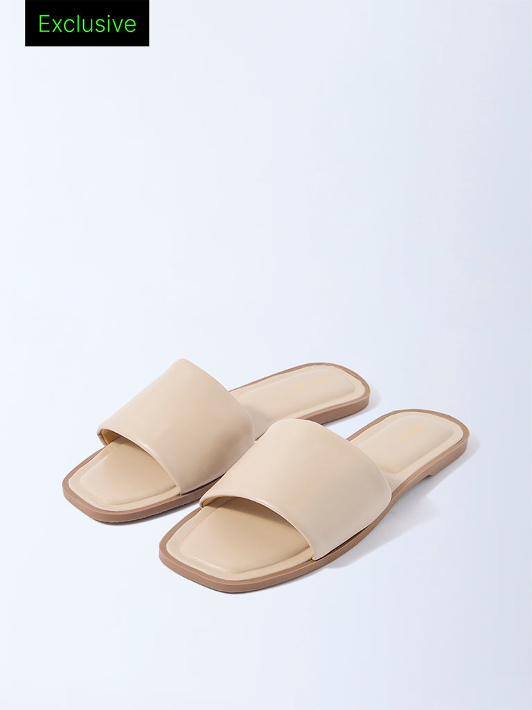 Embrace understated elegance with these beige slides from Luna Blu. Designed with a wide strap and a modern square toe. they rest on a flat sole with subtle contrast edges. Minimal yet versatile. this pair is perfect for pairing with breezy dresses. tailored separates. or casual off-duty looks.