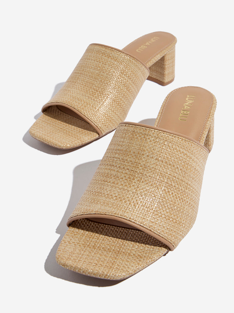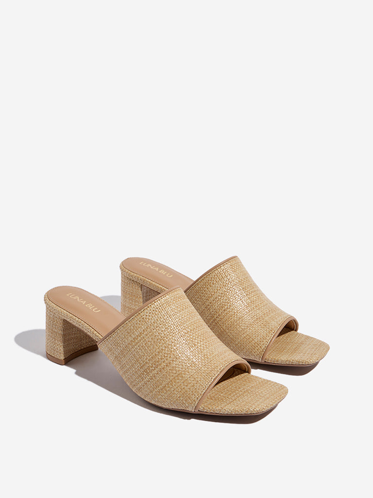 These beige block-heel sandals from Luna Blu feature a raffia-textured upper that adds a natural. woven finish to the design. The wide strap ensures a secure fit. while the sturdy block heel and cushioned footbed provide all-day comfort with effortless sophistication.