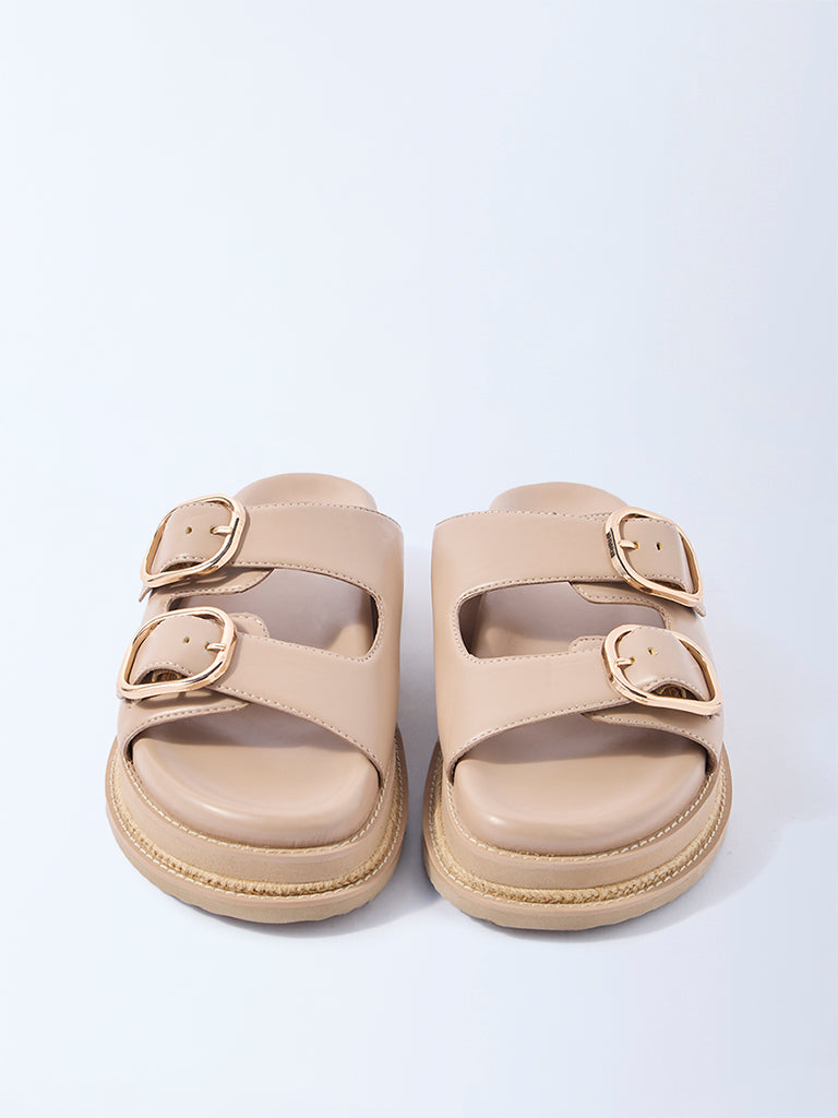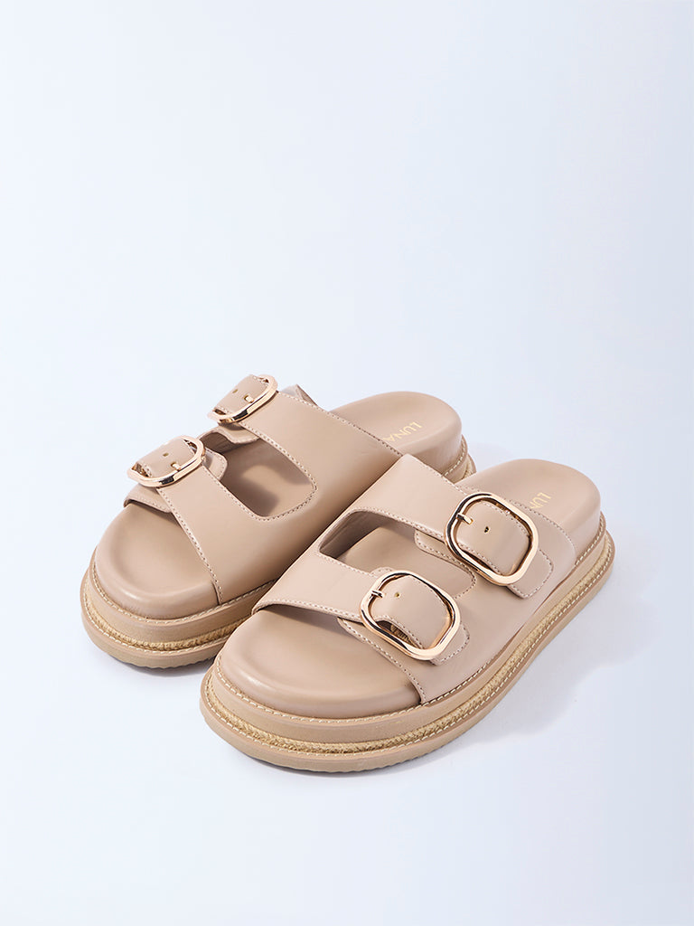 Redefine casual comfort with these beige dual-strap sandals from Luna Blu. Designed with broad straps featuring statement gold-toned buckles. they offer both style and support. The cushioned footbed and textured outsole ensure ease with every step. making them a versatile pick for relaxed. all-day wear.