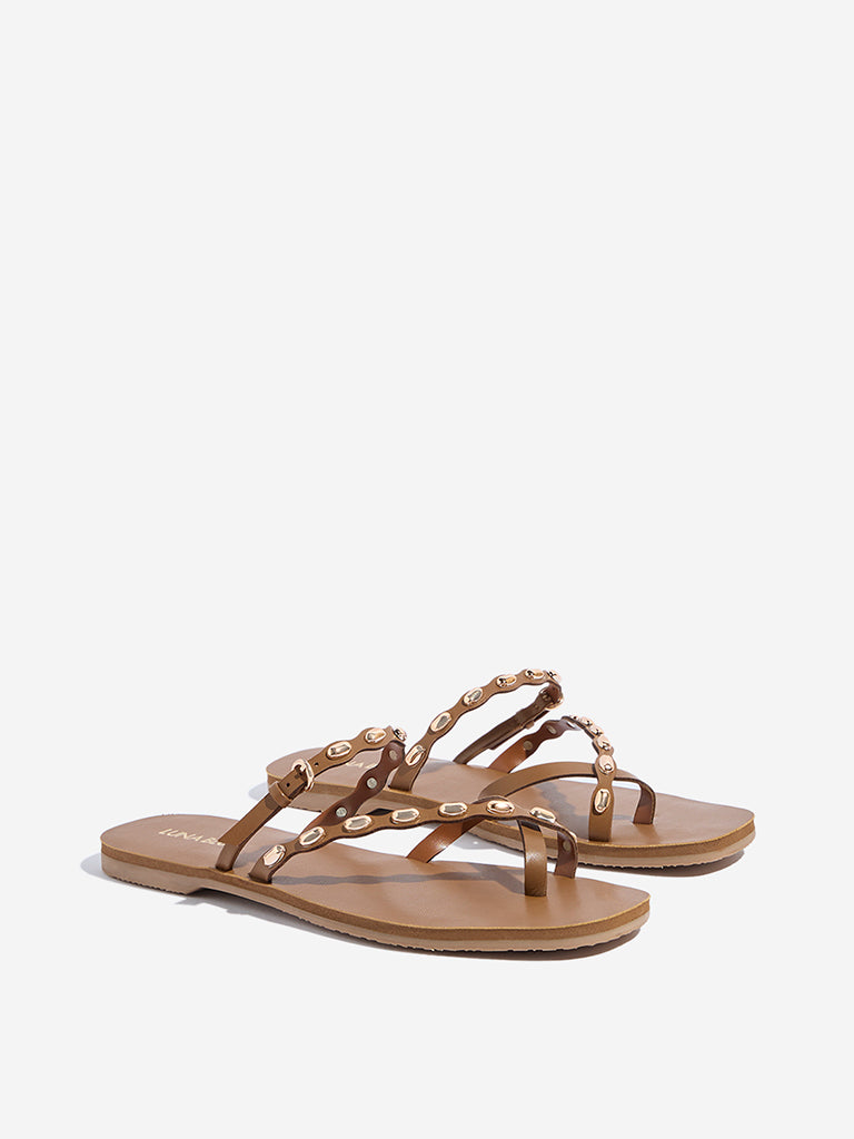 These beige slides from Luna Blu bring subtle sophistication to your everyday wardrobe. Designed with multiple slender straps across the foot and embellished with gold-toned studs. they offer just the right amount of shine. A cushioned insole ensures all-day comfort. while the textured outsole keeps every step grounded.