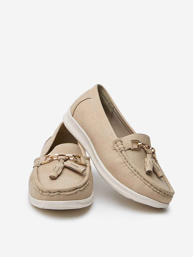 Add sophistication to your footwear collection with these beige loafers by Luna Blu. The elevated upper is adorned with chic tassels and gold-toned metal accents for a refined touch. Featuring a cushioned insole for comfort. a thick midsole for support. and a textured outsole for enhanced grip. these loafers seamlessly combine style and practicality.