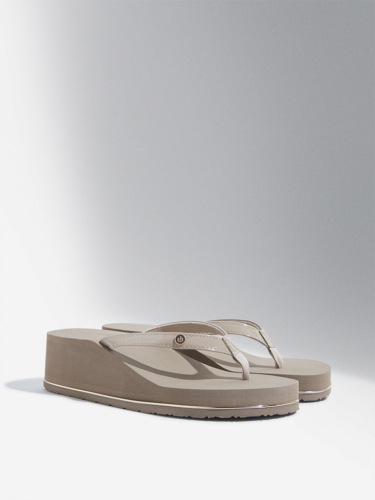 Luna Blu introduces these beige flip-flops featuring thong straps for a secure grip. They are equipped with a cushioned footbed and wedge heels. offering a comfortable walking experience.