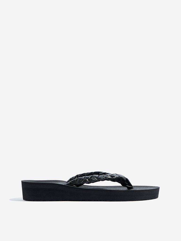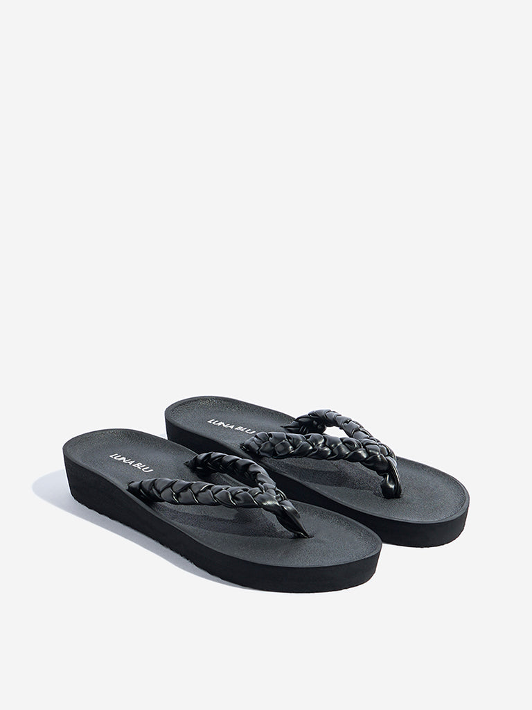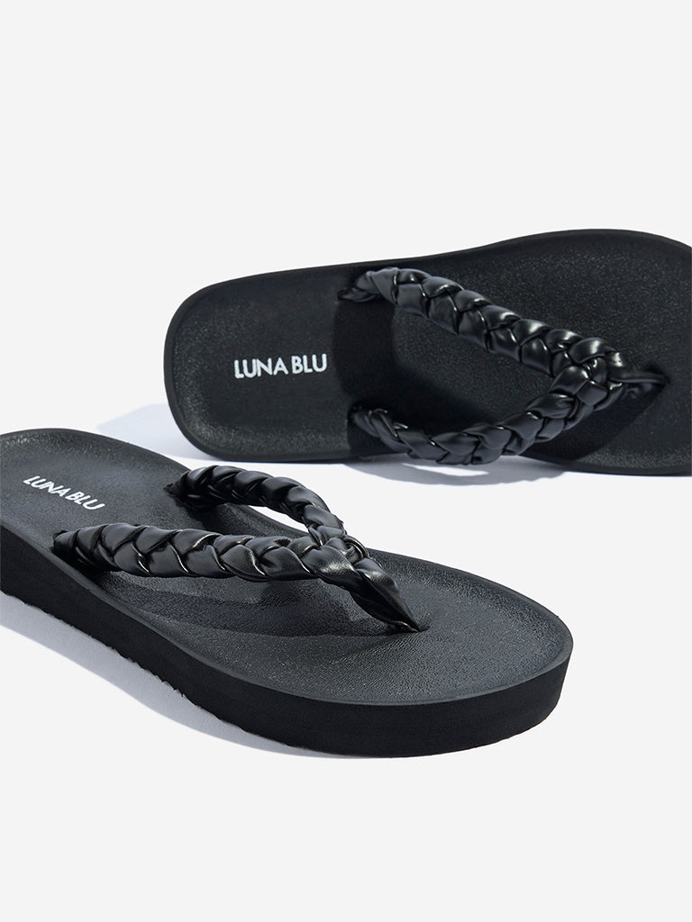 These black flip-flops from Luna Blu channel effortless cool with their contemporary braided straps and clean silhouette. Crafted for comfort with a cushioned sole. they strike the right balance between laid-back ease and everyday versatility.