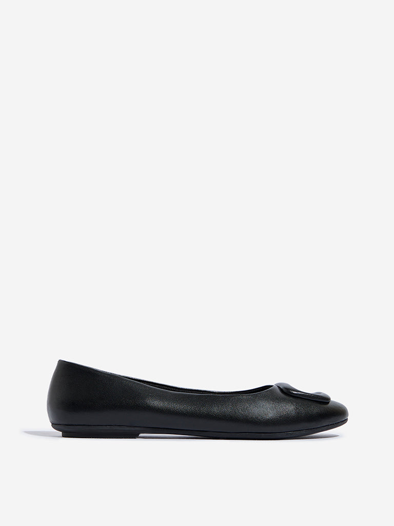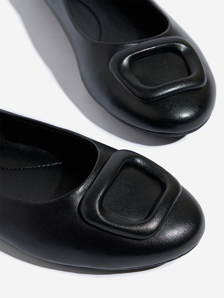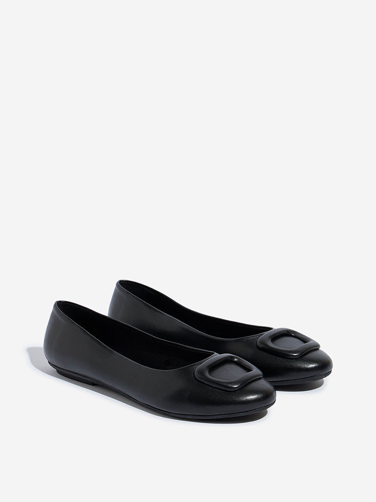 Luna Blu presents these black ballerinas to elevate your footwear collection to a wholesome level. Crafted with a sleek silhouette. they feature a chic metallic buckle accent on the upper for a sophisticated touch. Designed with a soft insole and a sturdy outsole. these ballerinas offer both comfort and durability. making them perfect for work or casual outings.