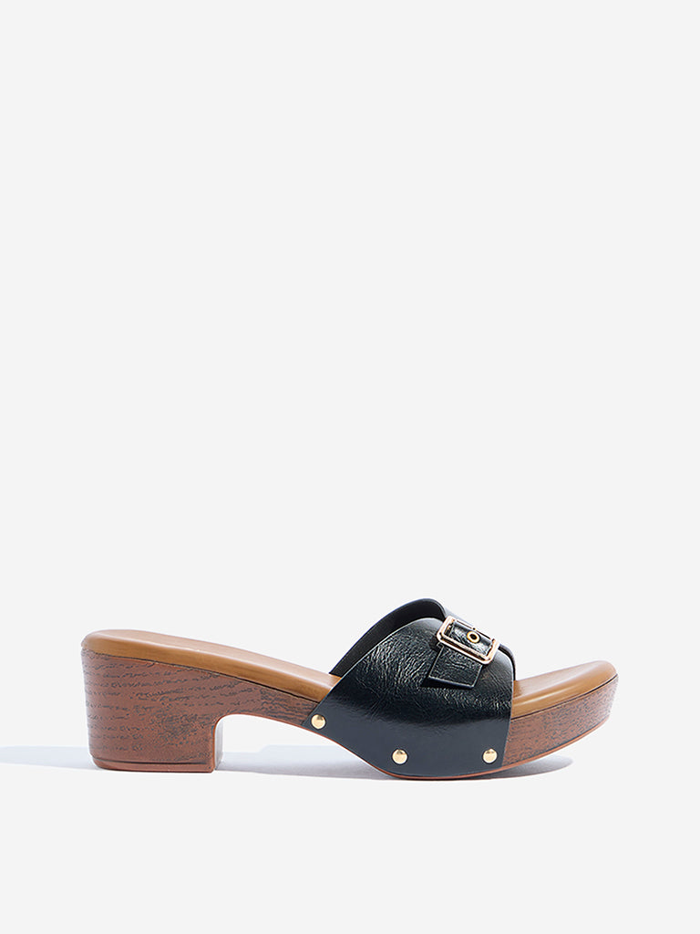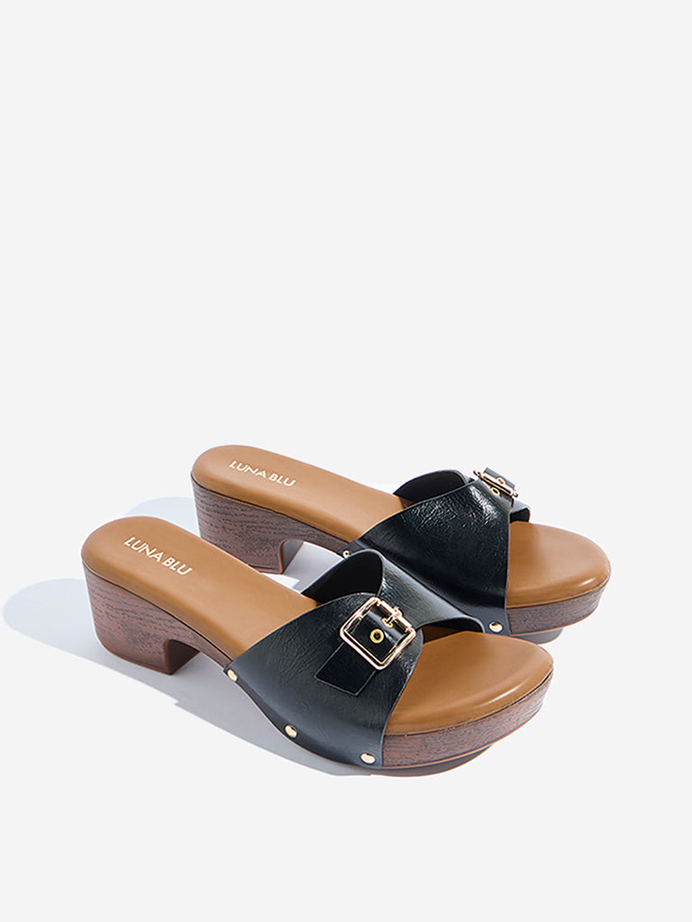 These black sandals from Luna Blu are fashioned with a broad strap accented by buckle and rivet detailing for a bold finish. Set on a comfortable platform heel and cushioned with a padded footbed. they blend statement style with all-day comfort.