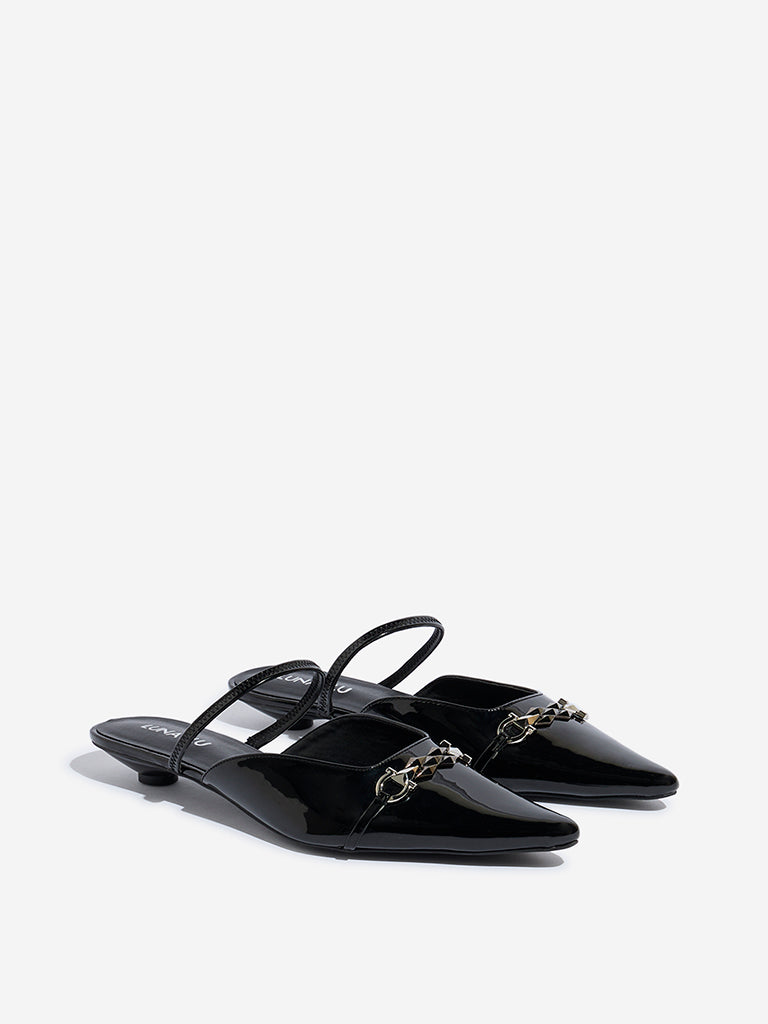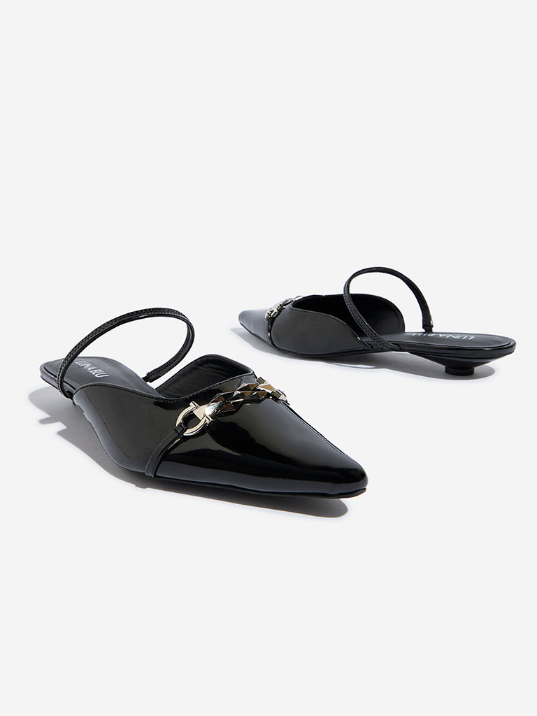 Luna Blu presents these black mules shoes. a perfect blend of elegance and edge. Featuring a pointed-toe vamp adorned with a sleek silver-toned chain. these sandals exude sophistication. The attached slingback design ensures a secure fit. while the soft insole and low heel provide comfort with a chic touch.