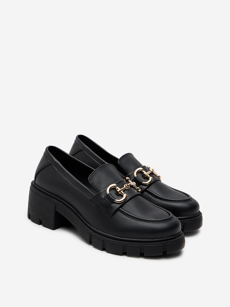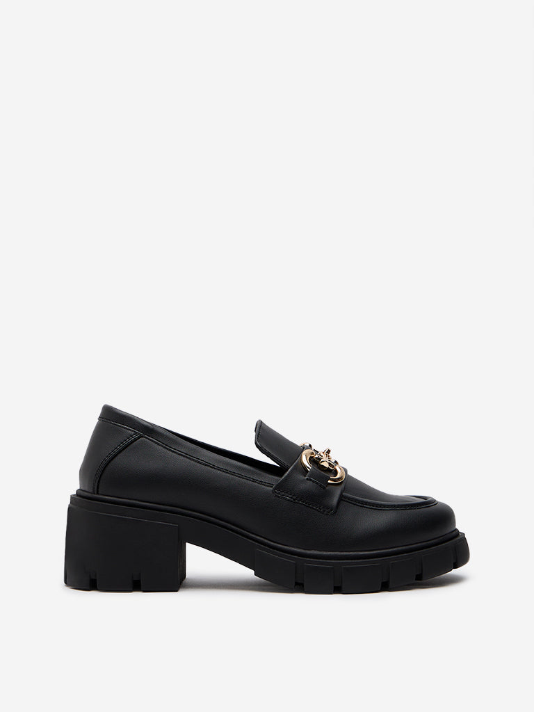 Luna Blu launches these black chunky platform loafers in quality material build. The trending footwear item boasts a gold metal accent on its round toe silhouette. leaving no room to make its mark. They offer supreme comfort with their soft insole and thick and grip-rich outsole.