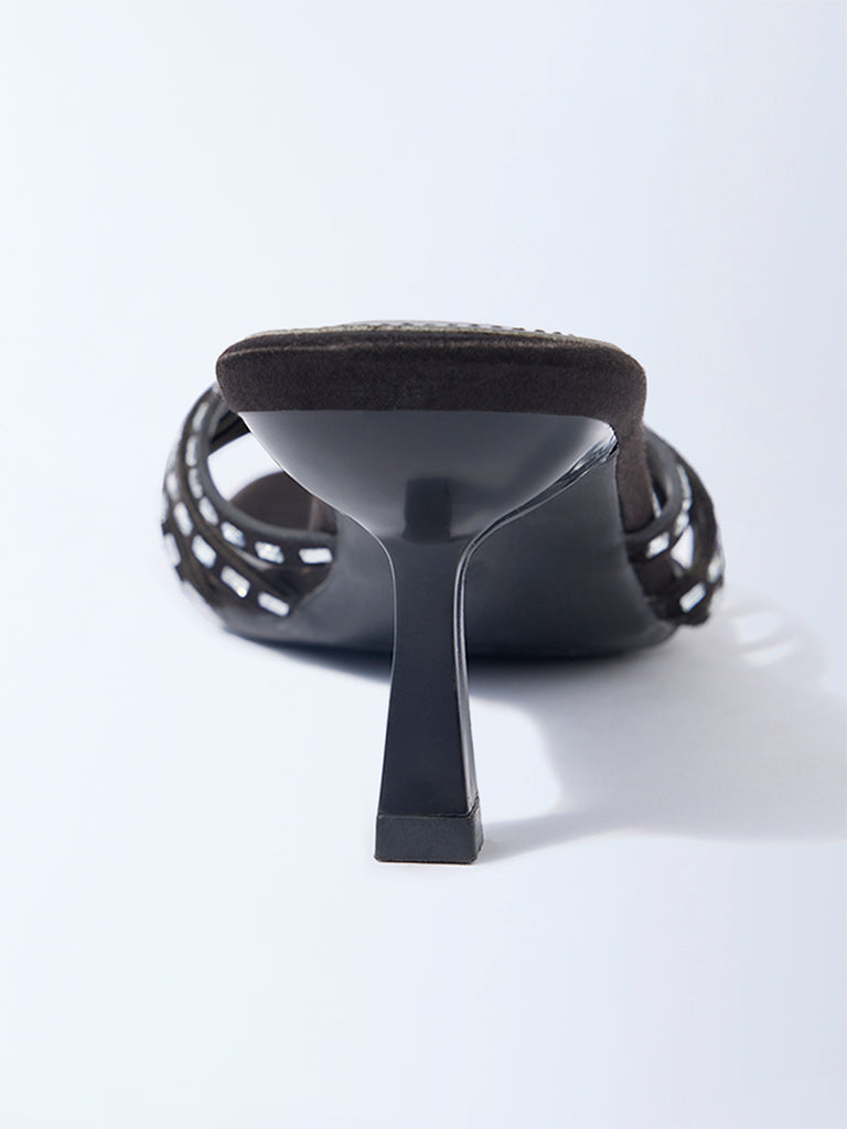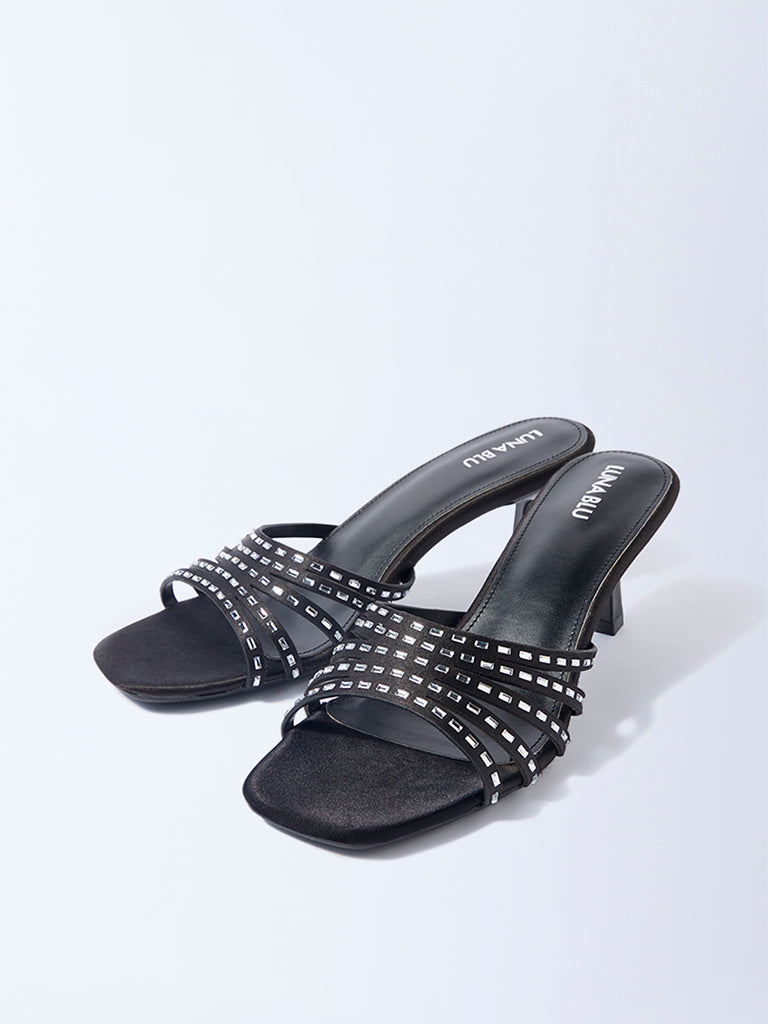 Let your feet steal the spotlight in these striking black sandals by Luna Blu. Multiple slim straps adorned with sparkling diamante create an eye-catching effect. while chic kitten heels offer a lift with effortless ease. A soft insole ensures all-day comfort. making this pair perfect for cocktail parties or elevating day-to-night ensembles with a contemporary edge.