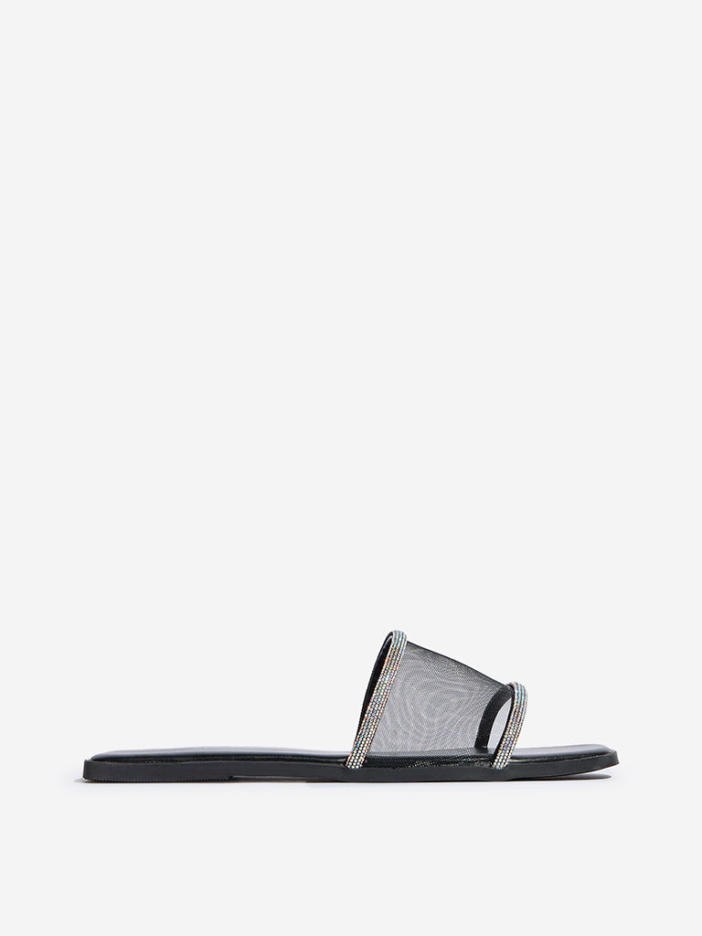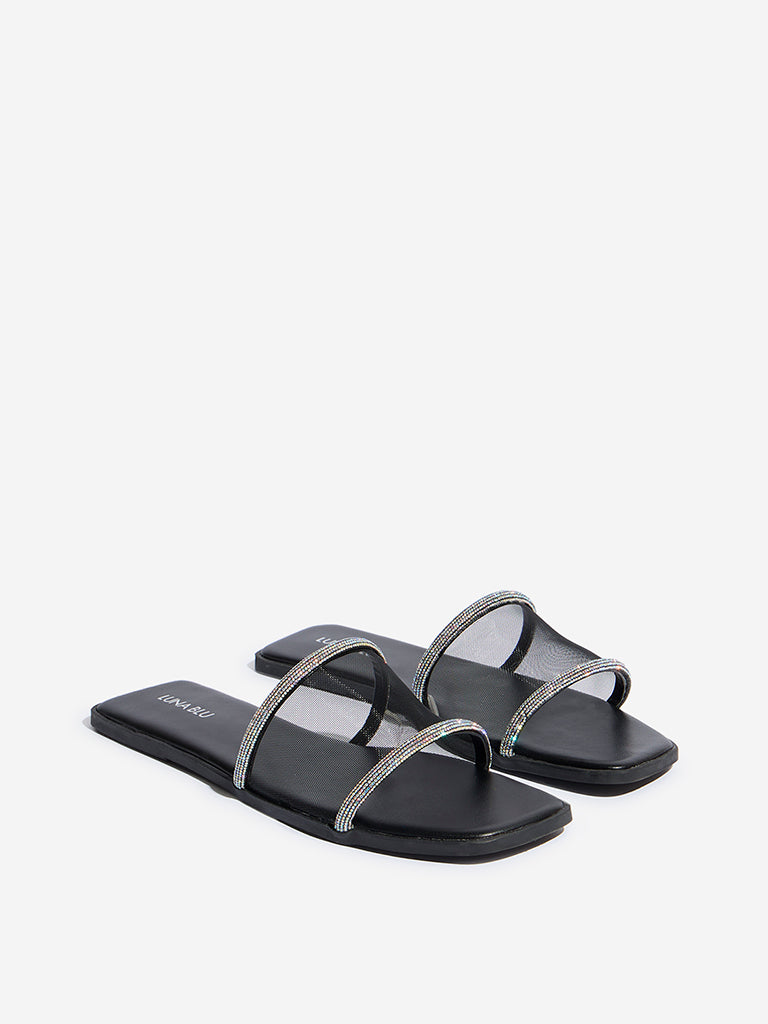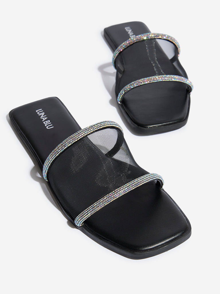 LUNA BLU Black Diamante Embellished Mesh Slides