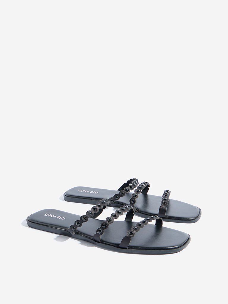 Luna Blu introduces these black slides. featuring multi-straps adorned with sleek black stone embellishments for a touch of understated elegance. Crafted for both style and comfort. they offer a padded insole for cushioned support and a textured outsole for secure traction.