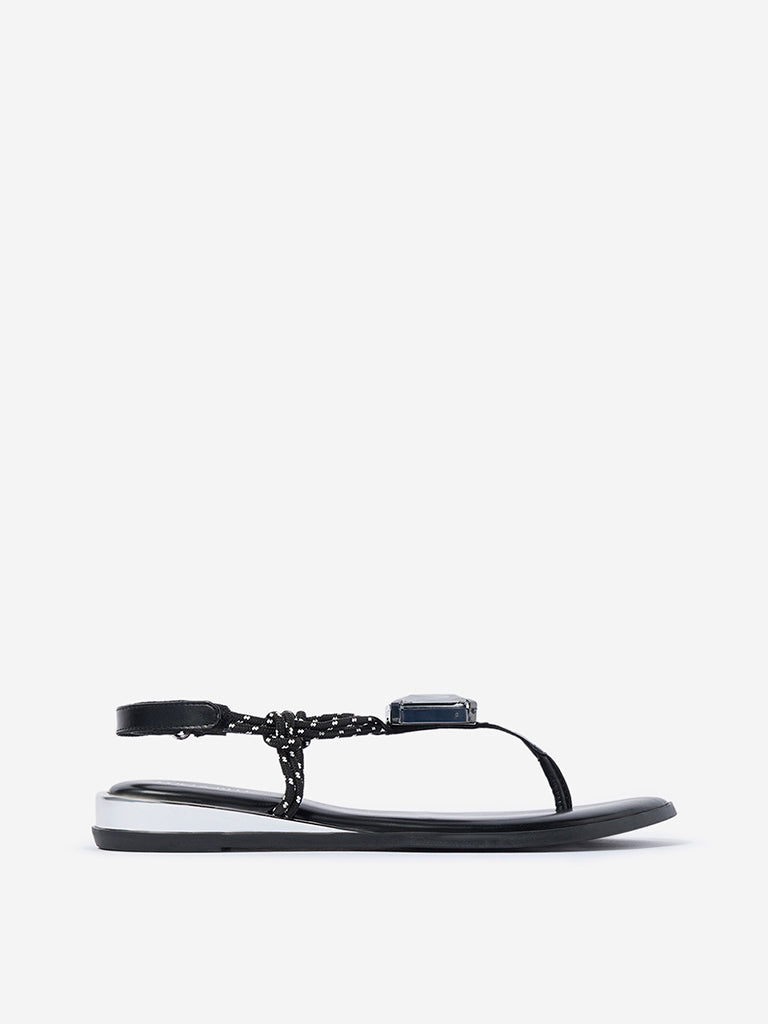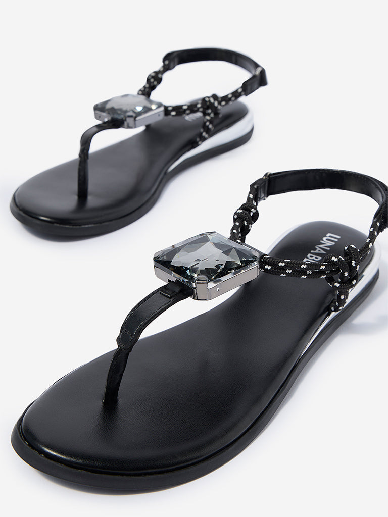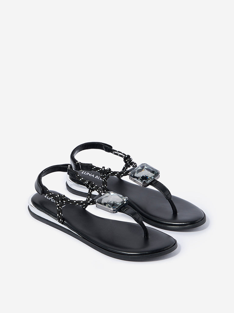 Add a touch of sparkle to your step with these black T-strap sandals from Luna Blu. Crafted with a glossy finish. they’re defined by a bold gemstone embellishment at the centre that catches the light with every move. Sleek ankle straps offer a secure fit while lending a contemporary edge.