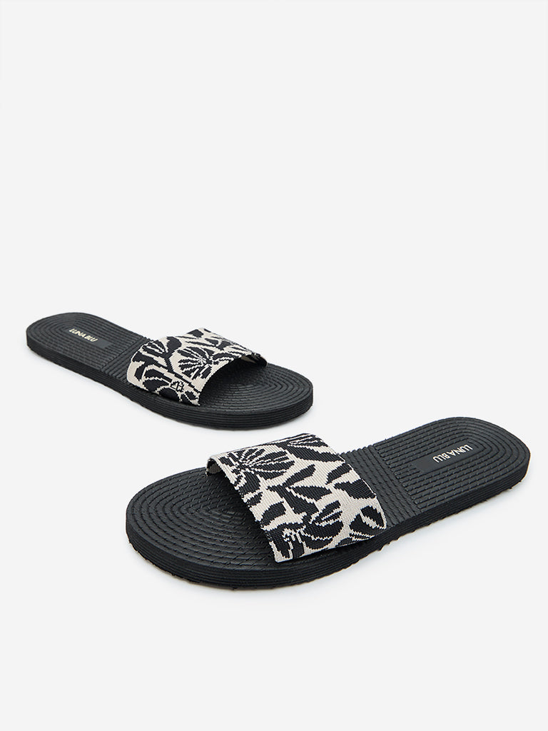 These black flip-flops by Luna Blu feature a knitted strap adorned with floral designs across the top. The footwear is ideal for a casual look as it offers a textured footbed for added ease and a sturdy outsole for reliable support.