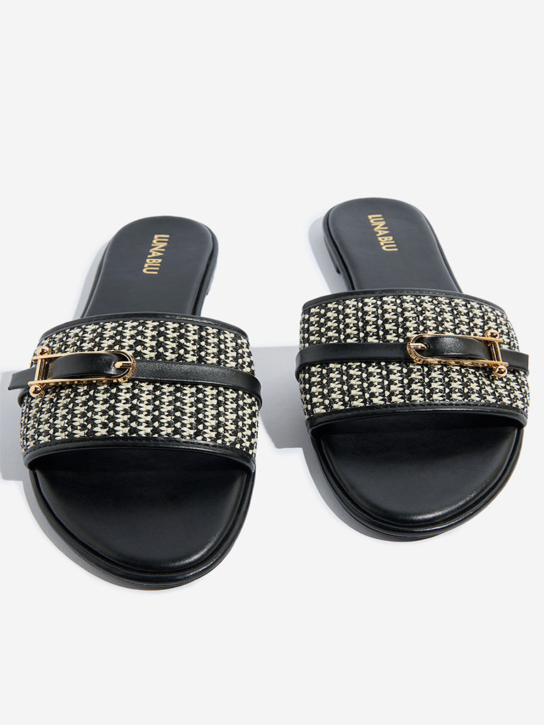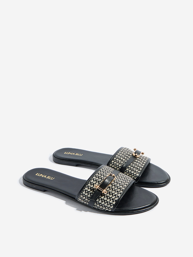 These black slides from Luna Blu blend modern style with everyday comfort. Featuring a jute-textured wide strap accented by a sleek buckle detail. they add a refined touch to casual looks. The soft insole ensures all-day ease. while the textured outsole provides a reliable grip with every step.