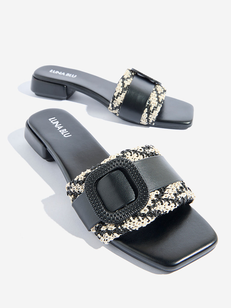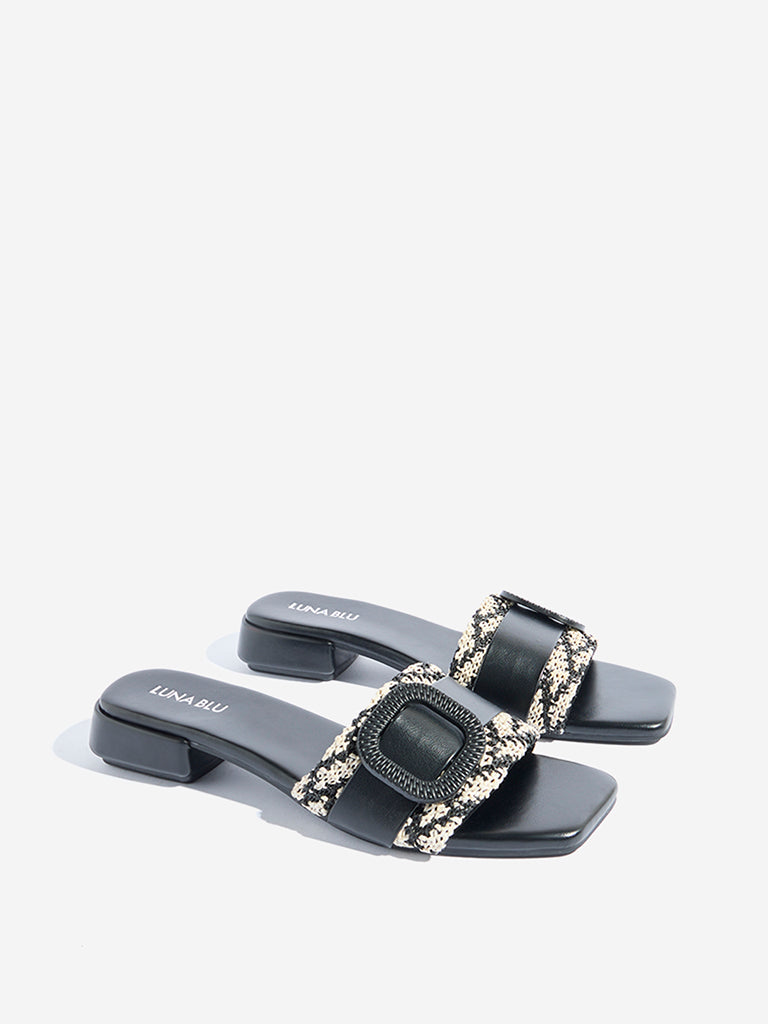 These black slides from Luna Blu feature a wide strap adorned with a striking jute-woven pattern. complemented by a gold-toned buckle for a touch of elegance. With a padded insole for all-day comfort and a textured outsole for reliable grip. these slides effortlessly combine style and practicality for a chic. laid-back look.
