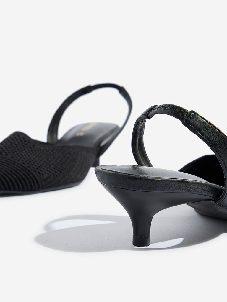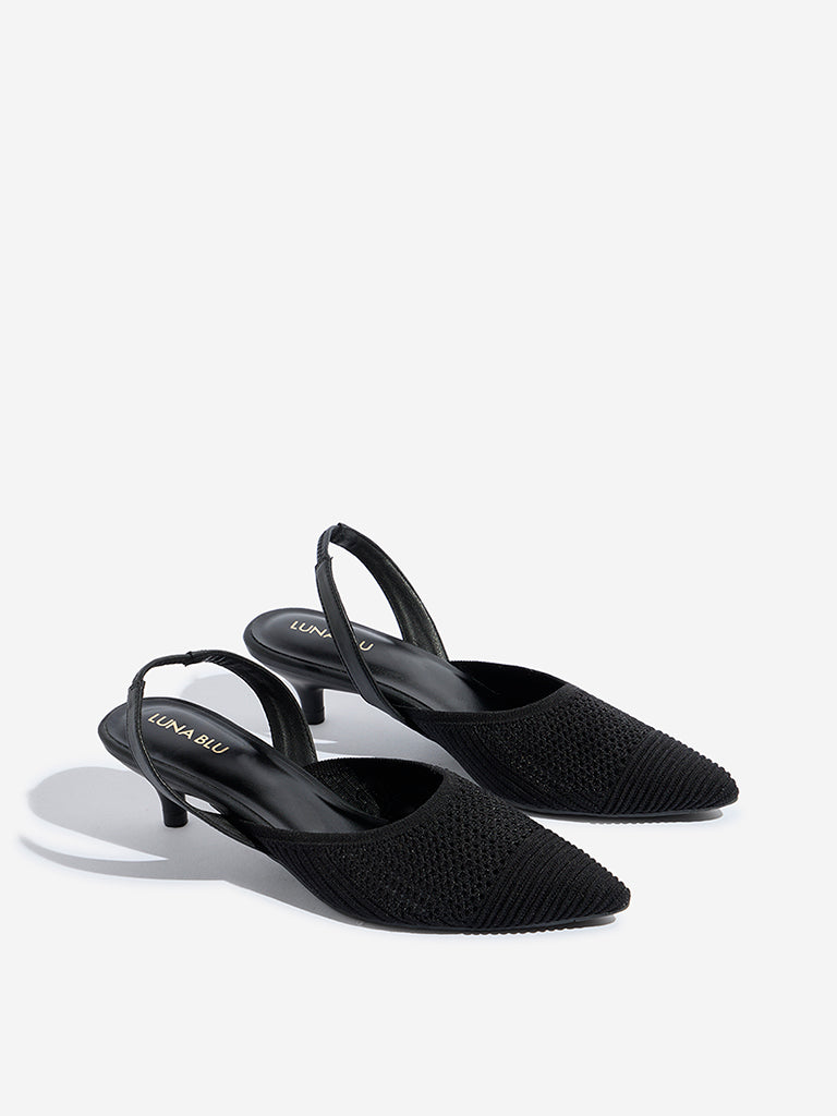 These black mules from Luna Blu feature a sleek pointed toe and a knit-textured strap for a refined silhouette. Designed with a slingback strap for a secure fit. they sit on a comfortable kitten heel that adds subtle elevation. A cushioned insole ensures all-day ease of wear.