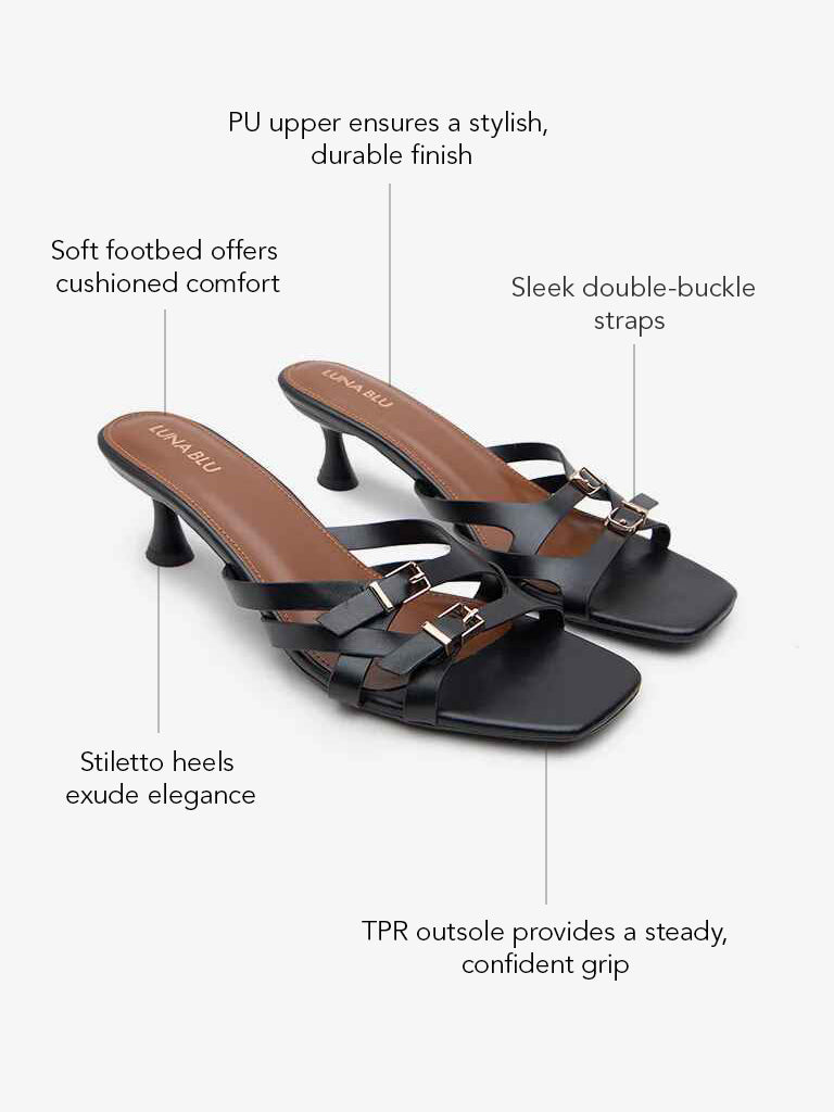 Luna Blu presents these black heels featuring sleek double buckle strap detailing on the upper. Designed with a soft footbed and durable outsole. they ensure comfort and longevity with every step.