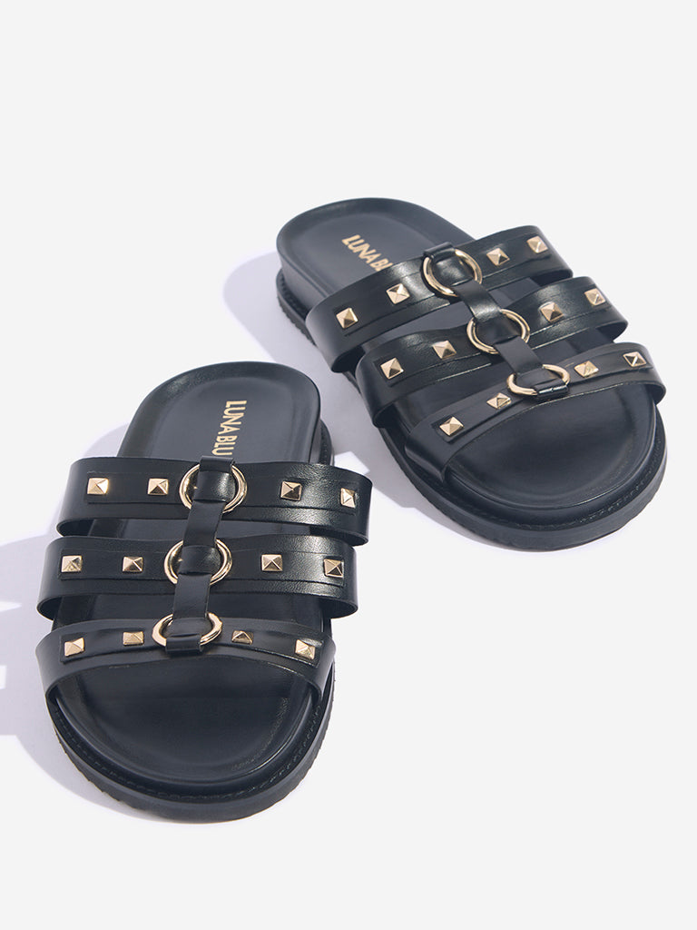These black sandals from Luna Blu showcase a slip-on style with multiple straps detailed in gold-tone studs and ring hardware for a bold finish. The cushioned insole ensures all-day . while the slightly raised sole and textured outsole offer added support and stability.