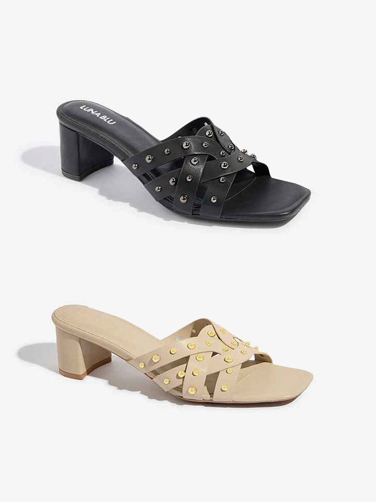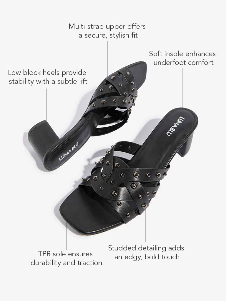 These black heels sandals by Luna Blu boast a chic multi strap upper adorned with studded detailing for an edgy touch. Designed with a soft insole and sturdy low block heels. they ensure a well-balanced and stylish fit.