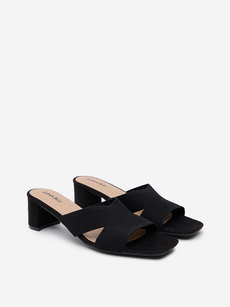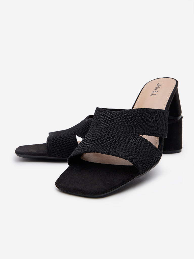 LUNA BLU Black Ribbed-Textured Block Heel Sandals