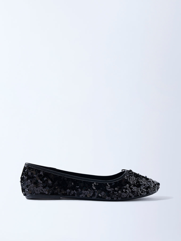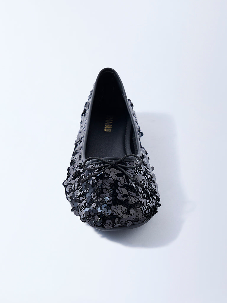 Add a hint of refined sparkle with these black ballerinas from Luna Blu. Detailed with tonal sequins and a petite bow accent. they balance elegance with ease. The round toe and cushioned insole ensure comfort. while the textured outsole provides steady grip for evenings on the move.