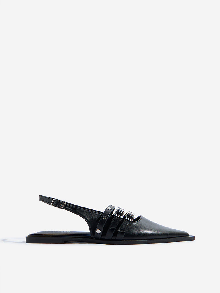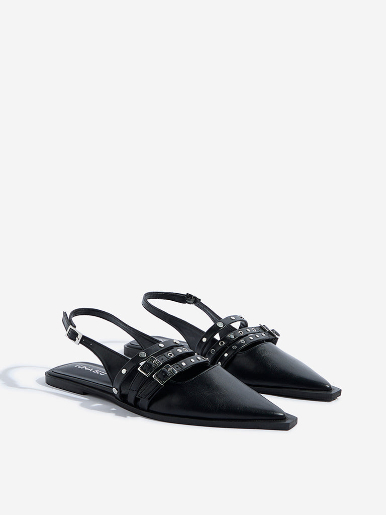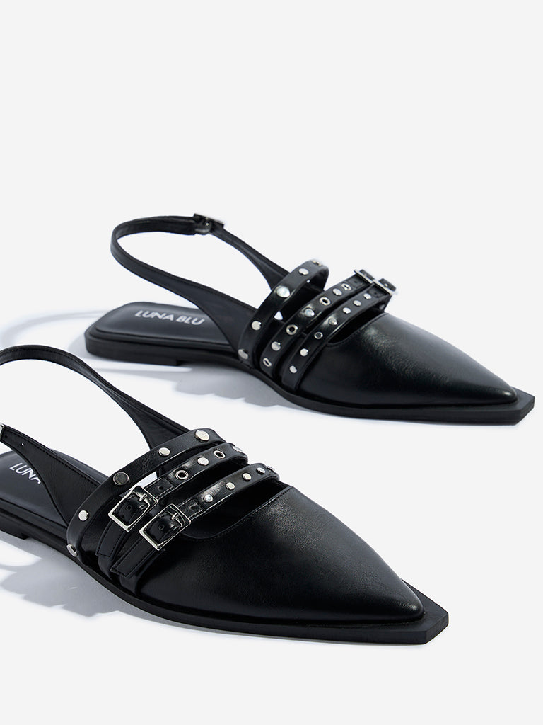 These black mules sandals from Luna Blu level up everyday looks with studded multi-straps and a sleek ankle strap secured by an adjustable buckle. Finished with a pointed toe. cushioned insole. and textured outsole. they deliver a sharp edge with lasting comfort.