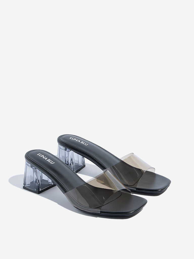 These black sandals from Luna Blu showcase a wide vinyl strap across the forefoot for a modern look. Elevated by a clear block heel and cushioned with a soft footbed. they deliver style and comfort in equal measure.
