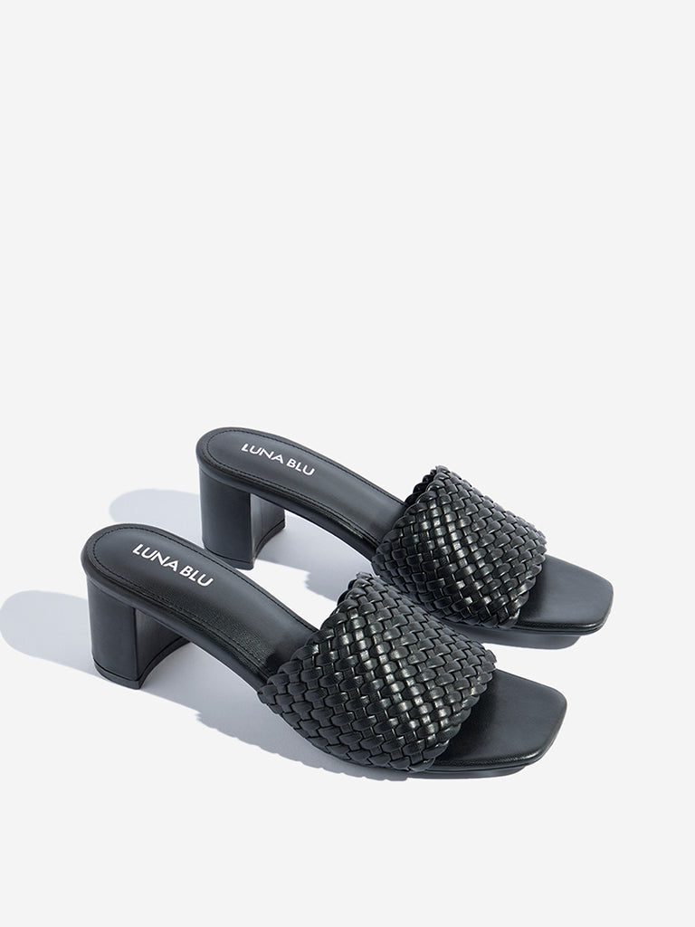 These black heel sandals from Luna Blu are fashioned with a woven-textured broad strap for a stylish finish. Designed with a sturdy block heel for added height. they offer a modern appeal. The soft footbed enhances comfort. while the textured outsole ensures a secure grip for effortless walking.
