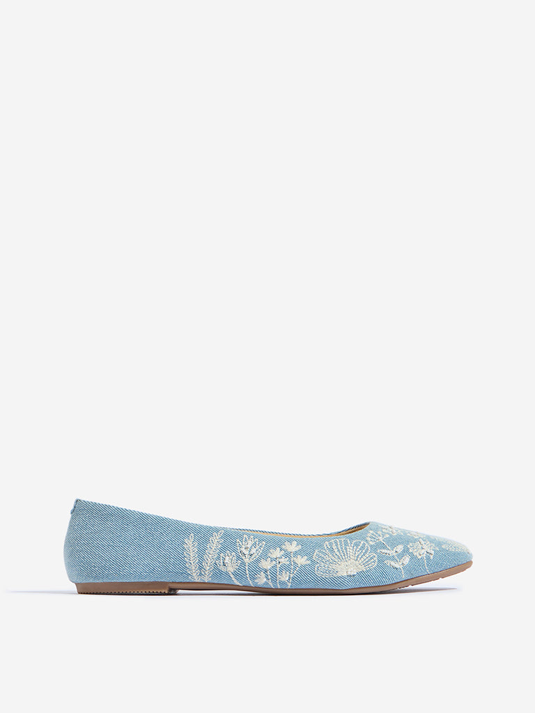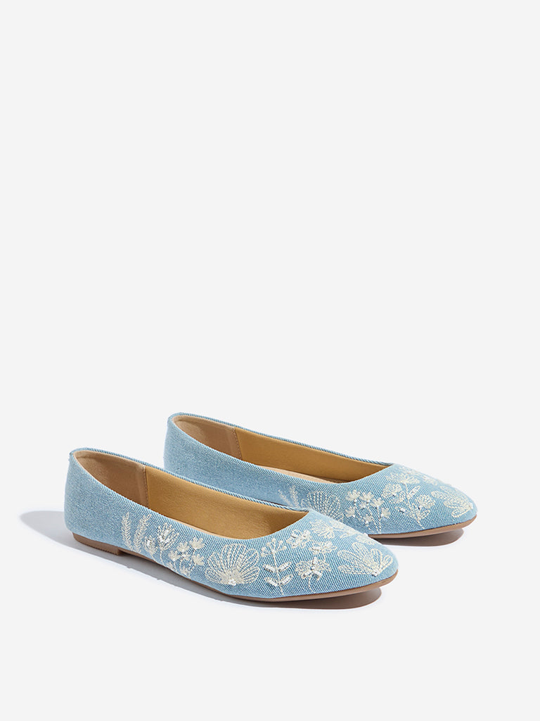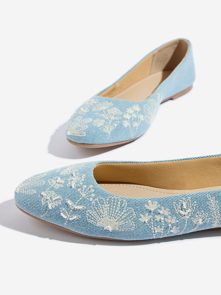 These blue ballerina from Luna Blu feature a denim-textured upper. adorned with intricate floral embroidery for a delicate touch. Designed for all-day ease. they come with a soft footbed for superior comfort and a textured outsole for a sturdy grip.