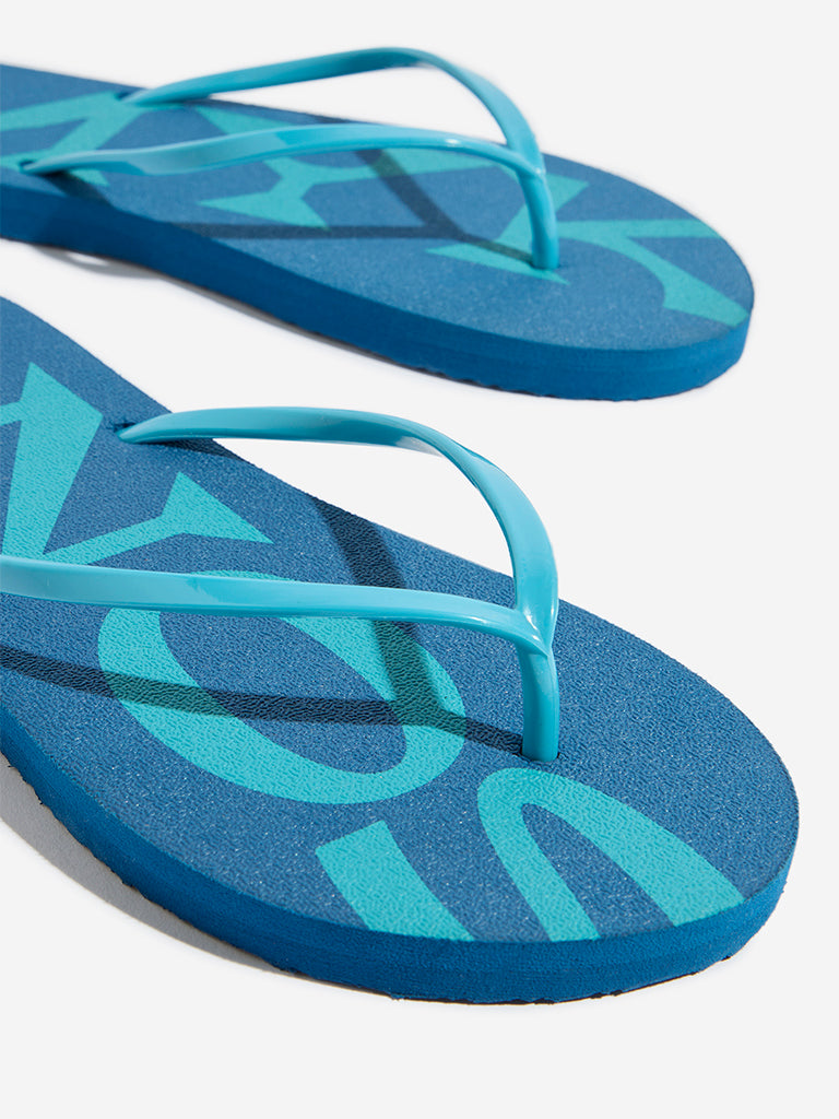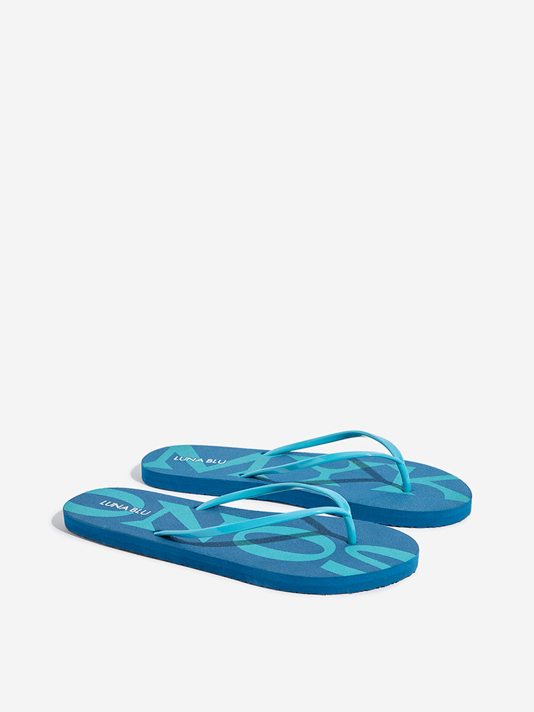 Luna Blu presents these blue flip-flops. featuring text-printed detailing on the soft insole for a unique touch. The textured outsole ensures a grip-rich experience. offering stability and comfort with every step.