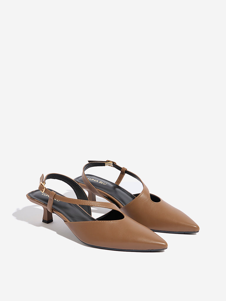 These brown pump-style mules by Luna Blu feature a unique. asymmetrical sling design in the upper. complemented by an adjustable buckle for a customized fit. With a soft insole for comfort and a sturdy attached heel for added support. these heels offer both style and stability. Perfect for elevating your look for any occasion. they bring a chic. contemporary touch to your footwear collection.