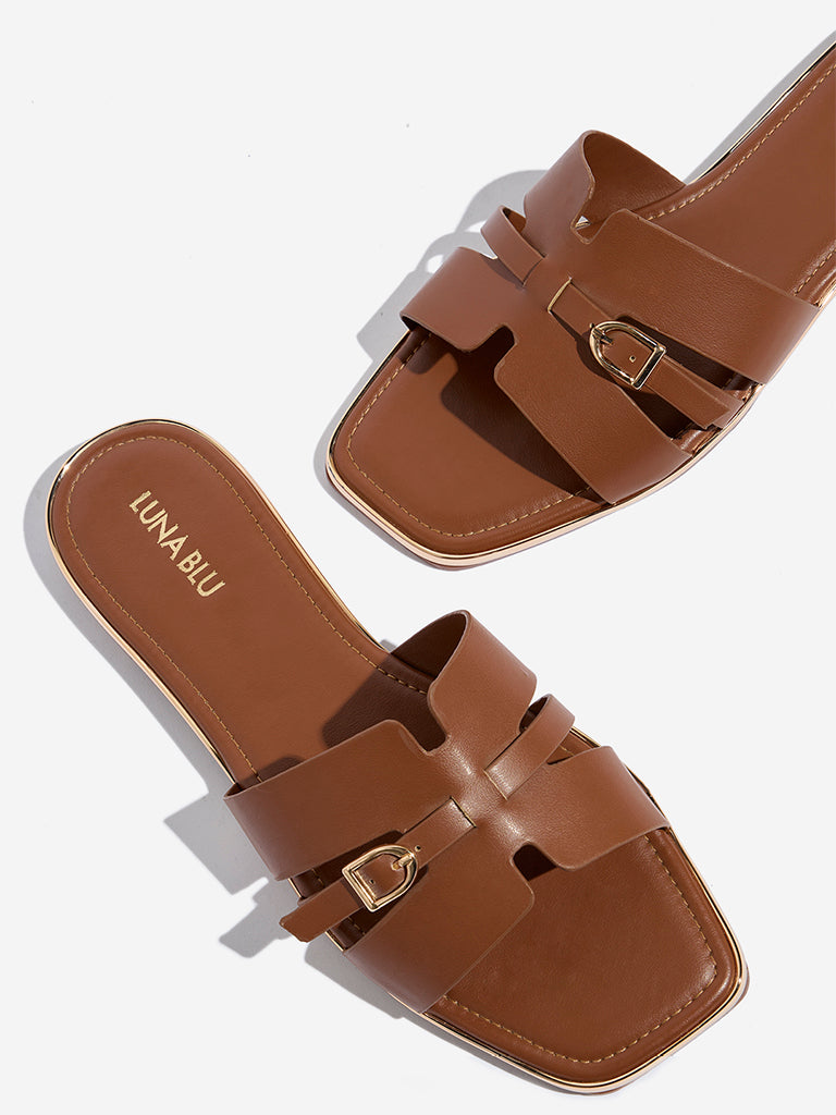 Luna Blu presents these brown belted slides. featuring a cut-out detailed upper with a stylish belt accent for a chic. modern look. Designed with a soft insole for all-day comfort and a textured outsole for reliable grip. these slides offer the perfect blend of fashion and function for effortless. everyday wear.