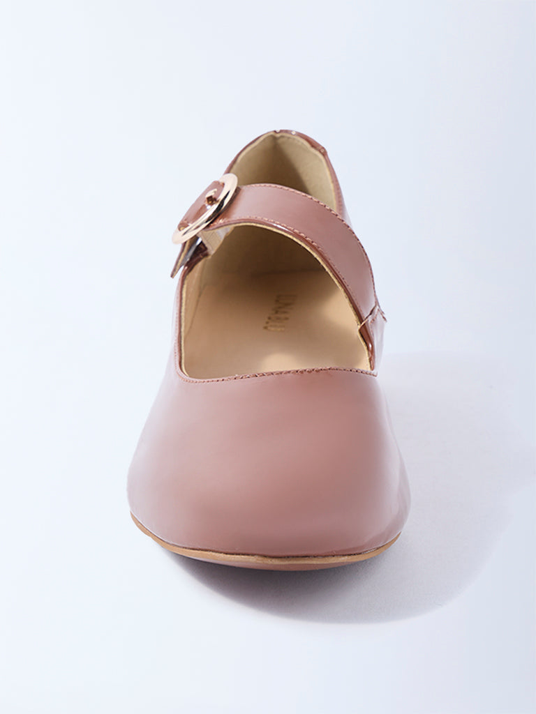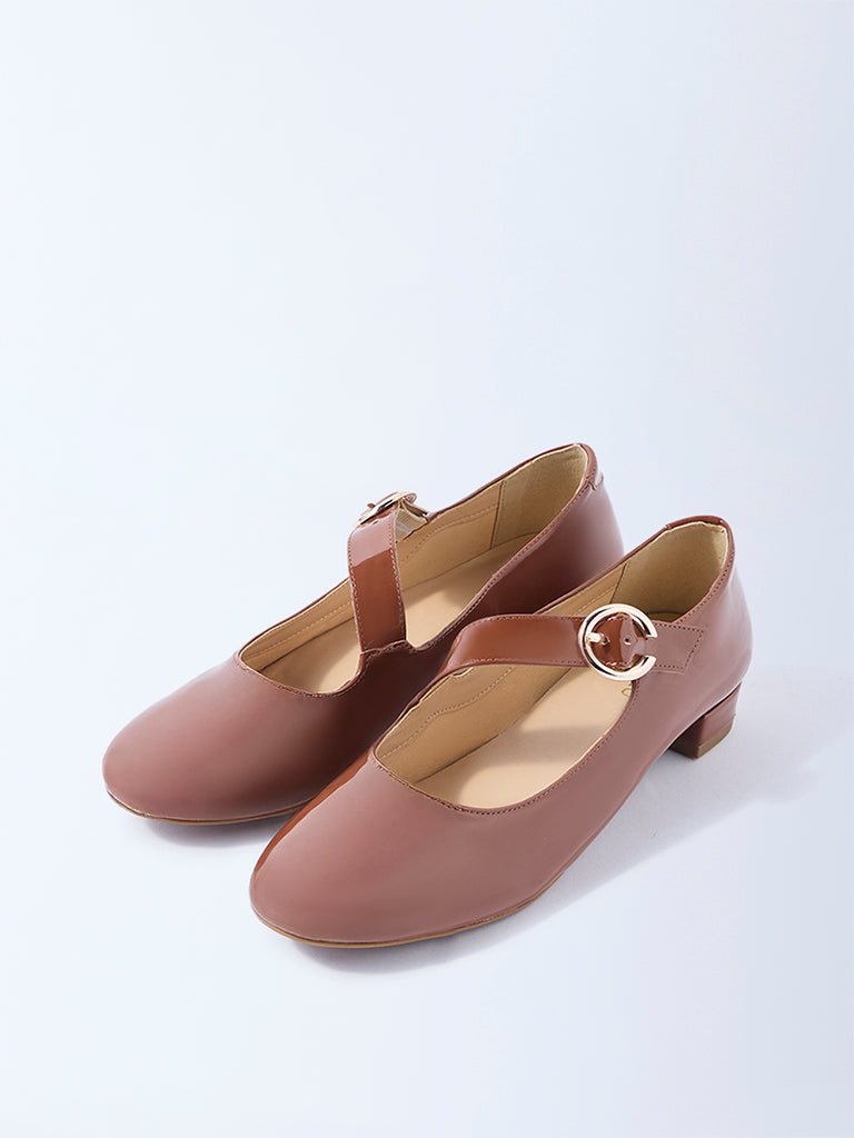 Channel timeless charm with these brown patent Mary Jane shoes from Luna Blu. Designed with a glossy finish. they feature an adjustable strap with a gold-toned circular buckle for a classic touch. The low block heel and cushioned insole ensure lasting comfort. making them perfect for both everyday wear and refined occasions.