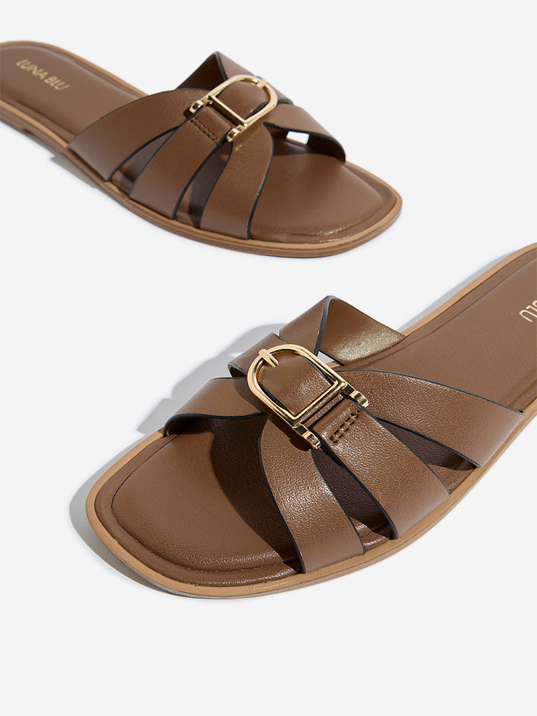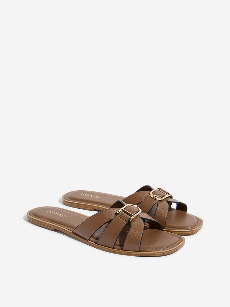 Luna Blu presents these brown slides. designed with a chic crisscross strap upper and a gold-accent buckle for added elegance. Complete with a soft insole and textured outsole. these slides ensure comfort and style for your casual outings.