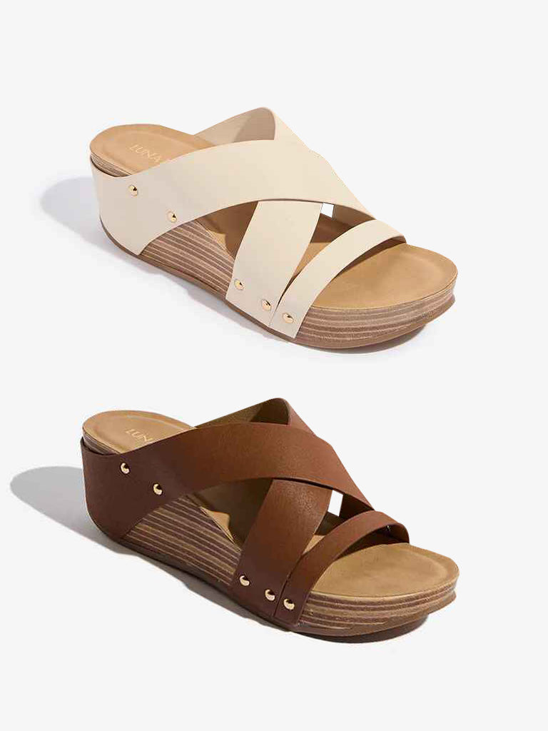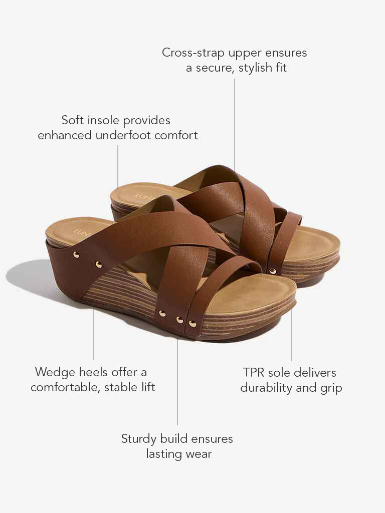 Luna Blu presents these chic brown wedge sandals. featuring elegant cross straps secured with gold-toned beads on the upper for a refined touch. Designed with a soft insole. a high midsole. and a sturdy outsole. they offer both style and stability. A perfect choice to elevate your everyday looks with effortless charm.