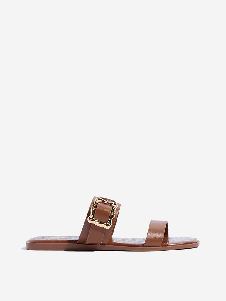 These brown sandals from Luna Blu feature twin straps with gold-toned buckle detailing. Built with a cushioned insole for comfort and a sturdy outsole for reliable grip. they’re a versatile pick for effortless everyday styling.