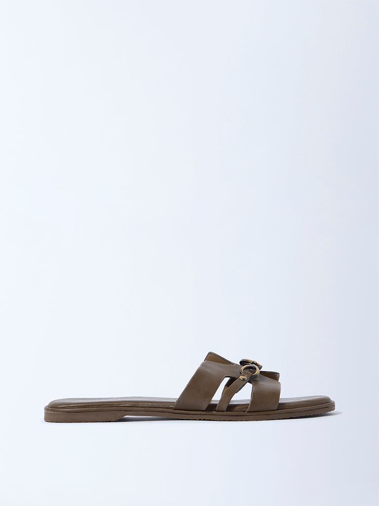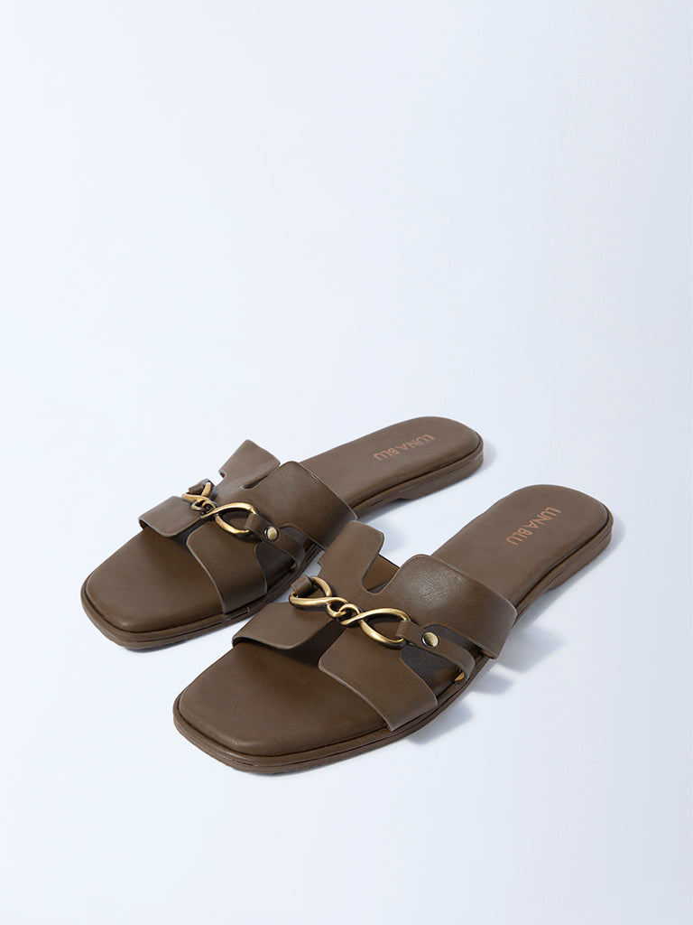 Luna Blu presents these brown slides showcasing cut-out straps linked by striking metallic hardware detail. The square-toe design features interlinked panels that lend a structured look while the padded insole ensures comfort through the day. Completed with a textured outsole for grip. this pair offers a contemporary finish suited for versatile everyday wear.