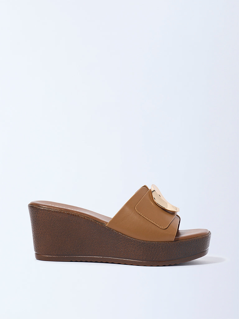 These brown wedge sandals from Luna Blu offer a refined update to your everyday edit. Featuring a wide strap topped with sculptural gold-toned hardware. they bring effortless sophistication with an earthy tone. Finished with a soft insole and stable wedge heel. they promise comfort without compromising style.