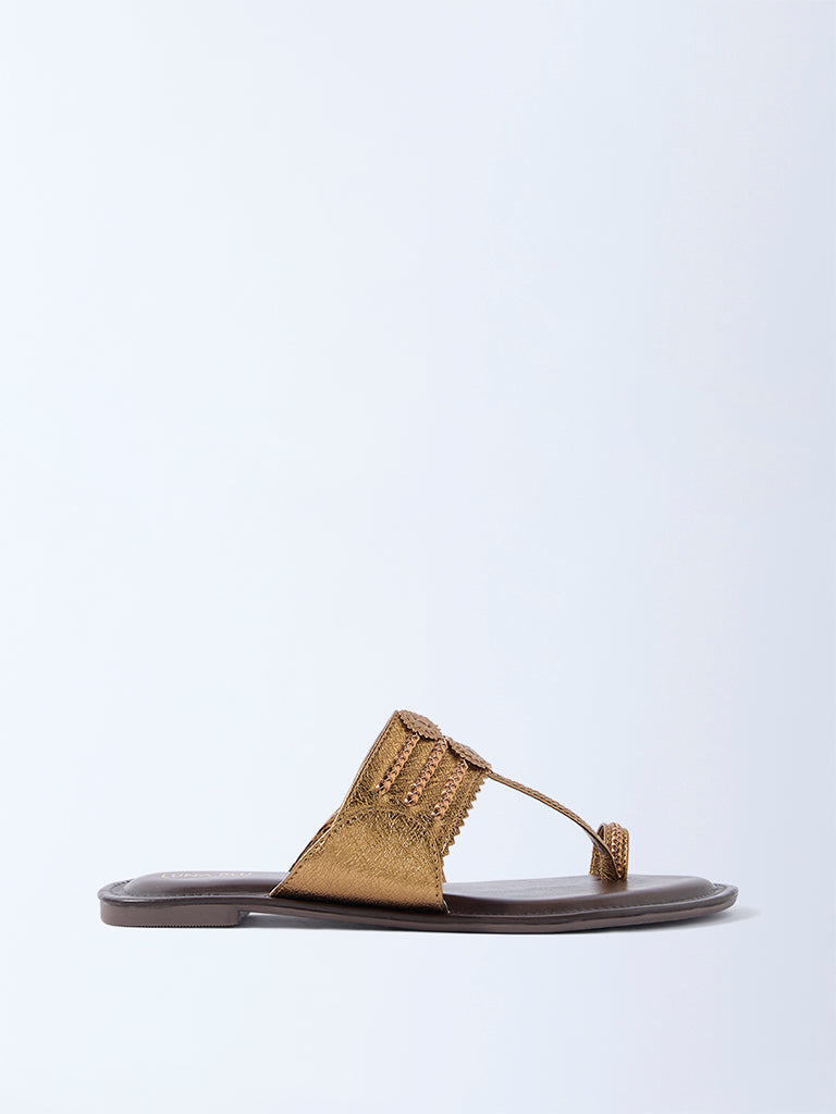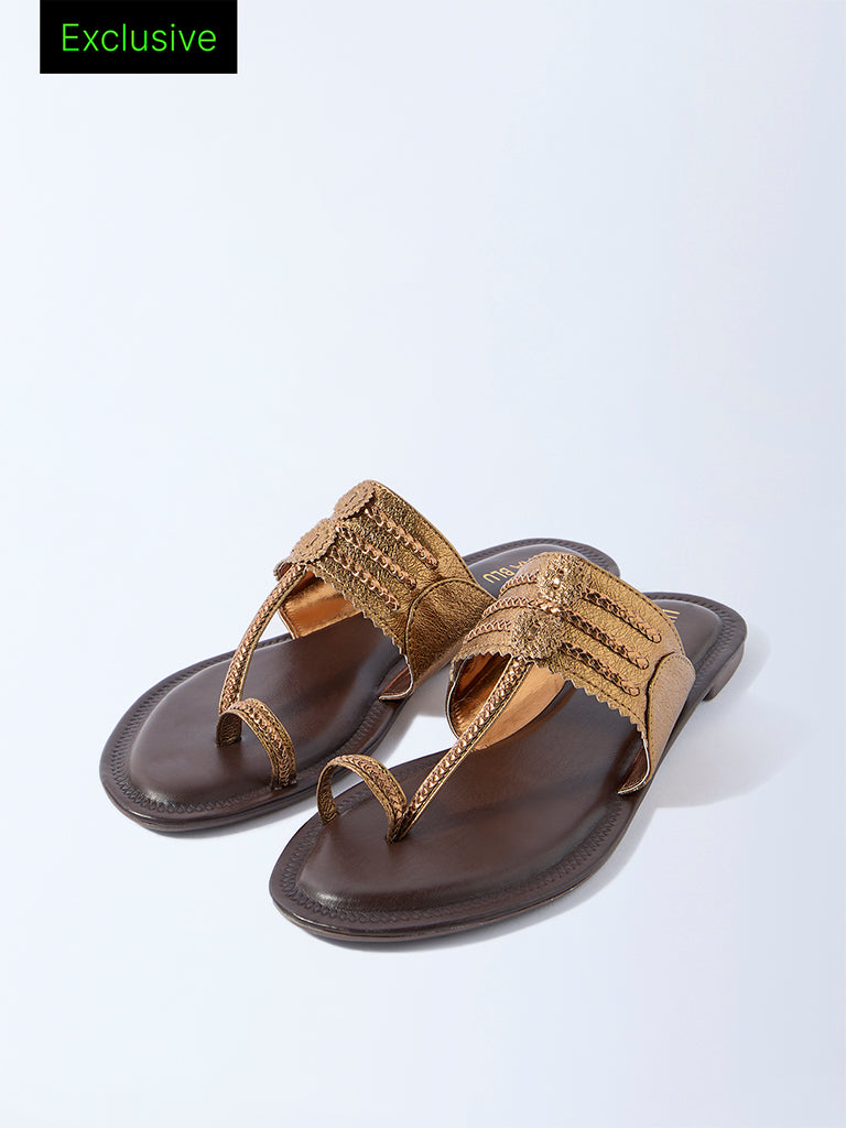 Give your footwear collection a festive edge with these brown Kolhapuri sandals from Luna Blu . Rendered in a metallic finish. they combine traditional craftsmanship with contemporary flair. The classic thong strap design ensures a secure fit. while the cushioned footbed offers comfort for all-day wear.